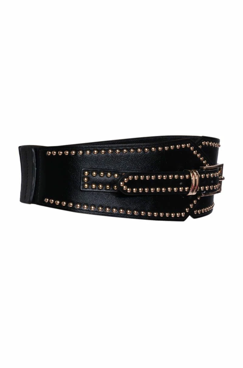 The AKIRA Label Aint It Fun Studded Waist Belt features a faux leather base, a gold metallic buckle closure, pointed leather design, and flat faux gold studded detailing. Complete with elastic band at the back for a more comfortable fit. Sits atop the waist for a cinched look.