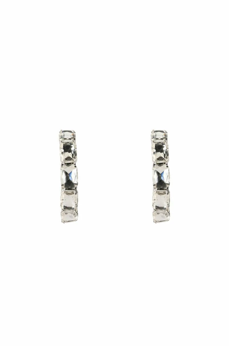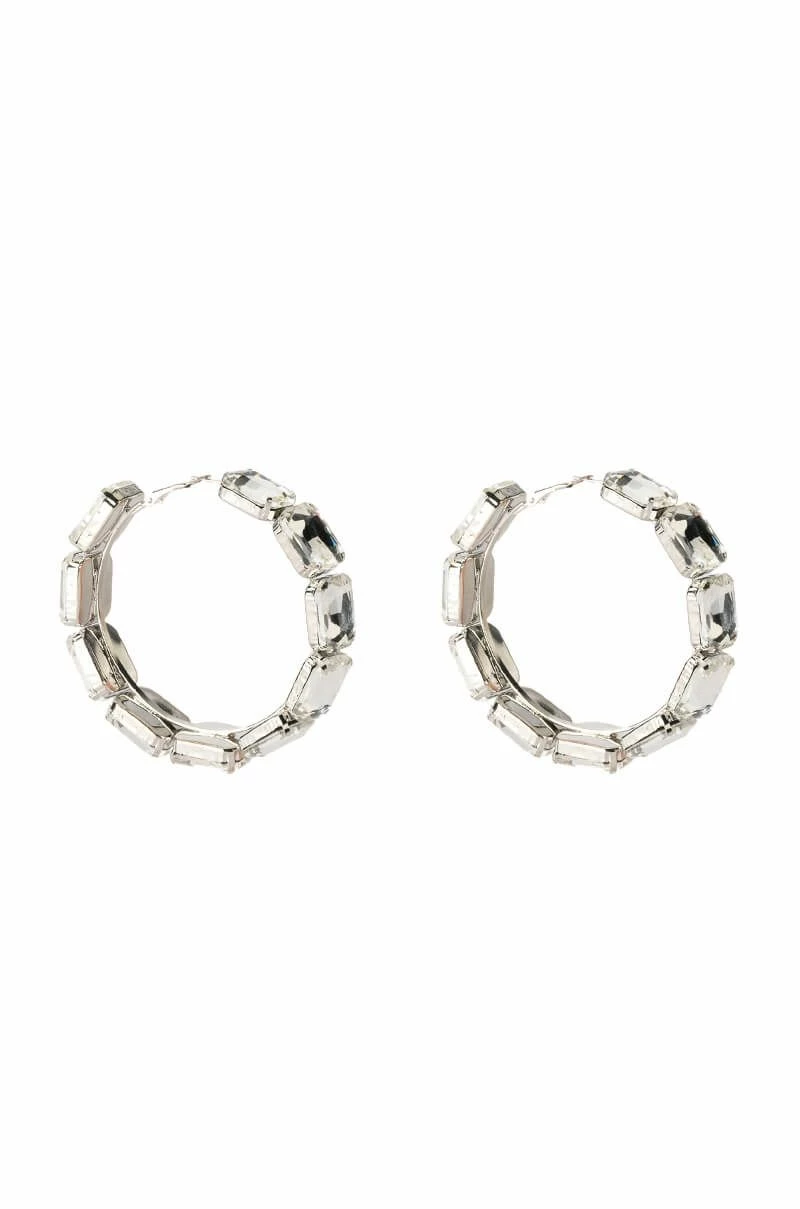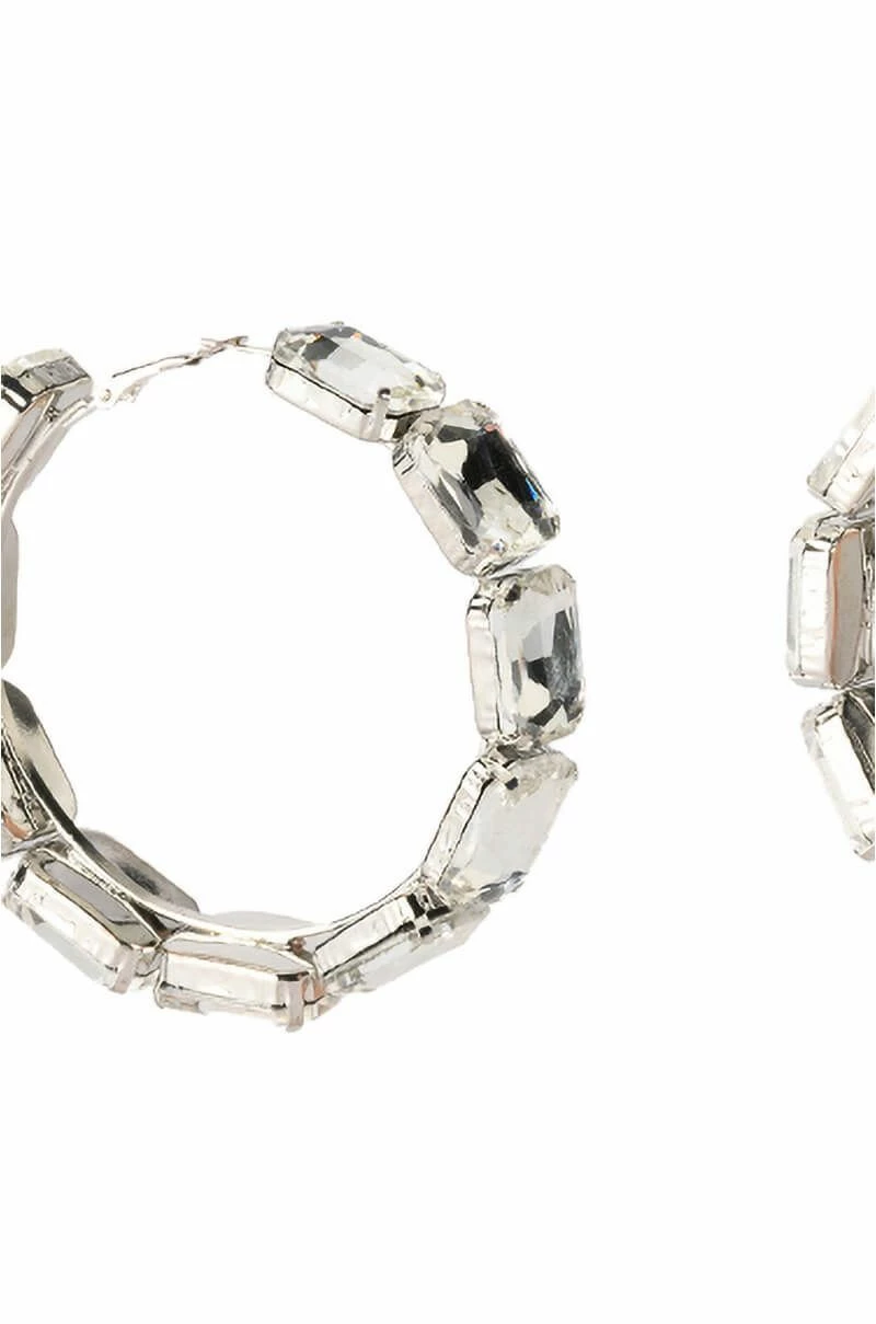 The AKIRA Label All Bling Everything Hoop is an oversized hoop earring featuring a faux silver metallic base, gemstone embellishments, a circular silhouette, and lever back fastening.