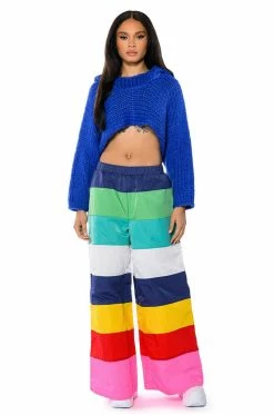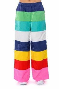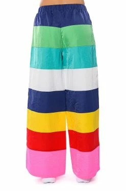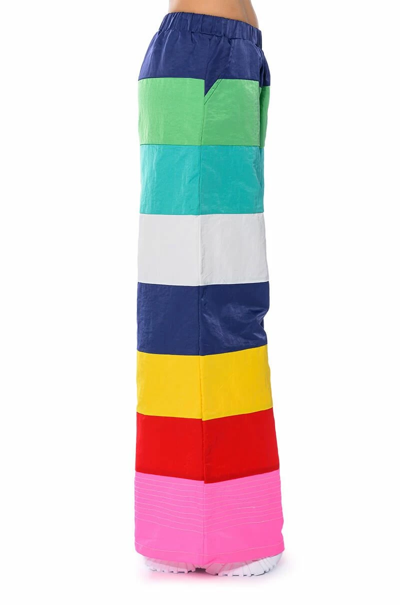 Make a statement in The AKIRA Label All Eyes On Me Wide Legged Pants! These bottoms feature a lightweight nylon fabrication, a high rise waistline with elastic waistband, bold colorblock detailing, a wide leg silhouette, and an embroidered detail at the hems. Style these colorful and fun pants with platform pumps and a cropped tee to complete your look.