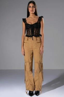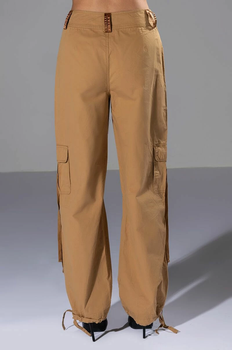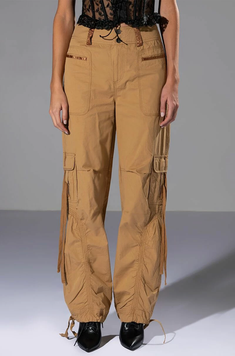 The AKIRA Label All In A Days Work High Rise Cargo Pant is made from a smooth, cotton fabrication and features a high rise waist, working belt loops with satiny detail, and a zip-up to double button front closure. Complete with tie patch pockets at the side, utility seaming, slit front pockets, and drawstrings at the bottom hems for a cinched ankle look. Pair with a bodysuit and heeled booties for an effortless off-duty look!