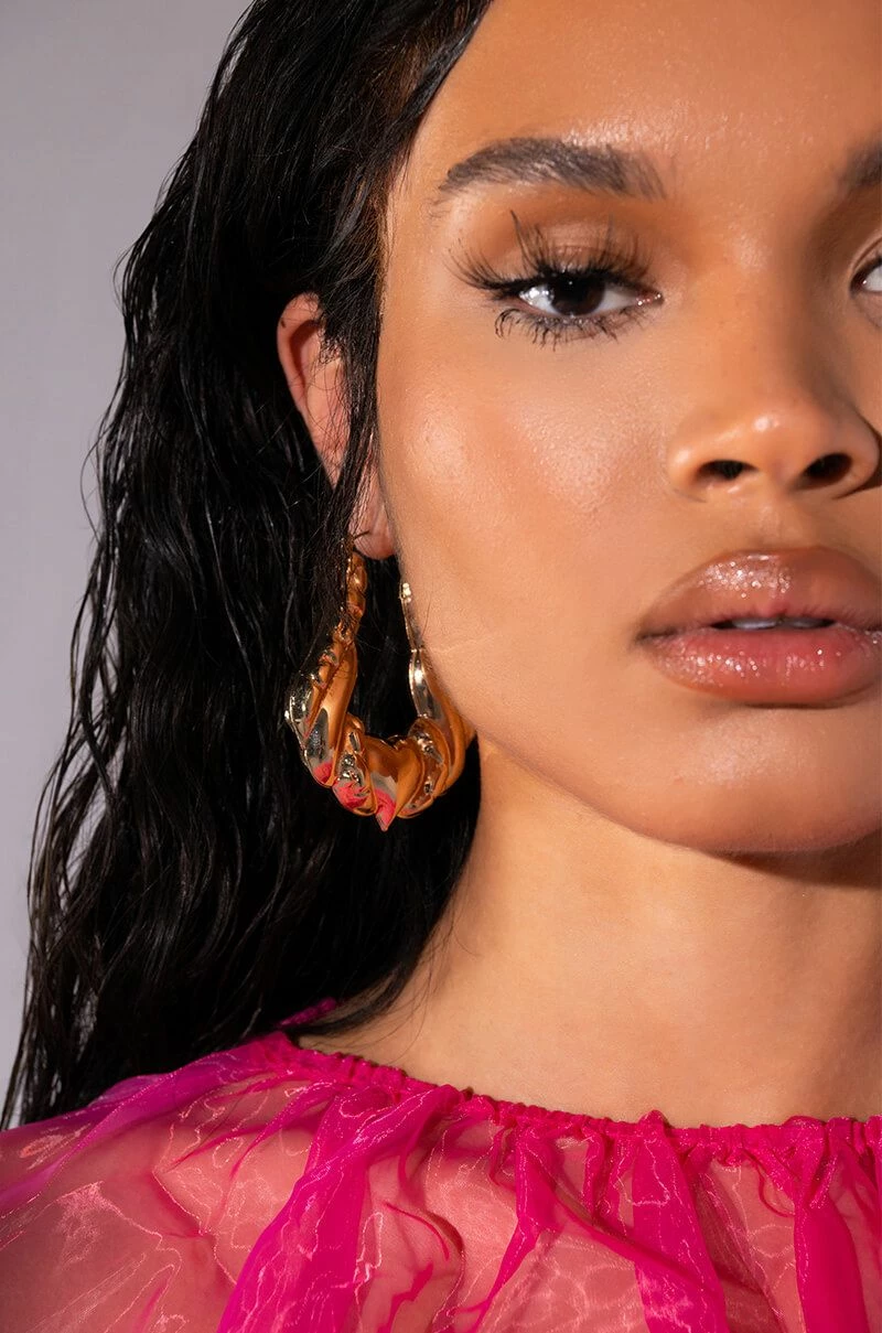 The AKIRA Label All That Jazz Hoops are a set of door knocker hoops made from a faux gold metal base featuring a textured design, a large hoop silhouette, heart detailing, and lever back fastenings.