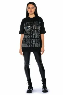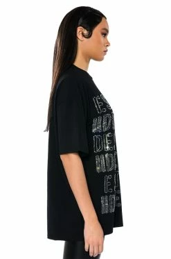 The AKIRA Label Alphabet City Oversized Graphic Tshirt is made from a stretchy cotton fabrication and features a crew neckline, short sleeves, and a boxy, oversized silhouette. Complete with mirror gem lettering in front. Style this glitzy piece with anything from your favorite kicks to booties to make a sparkling statement!