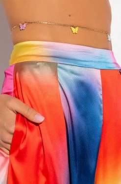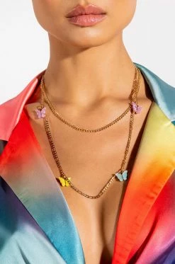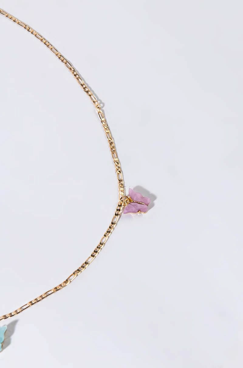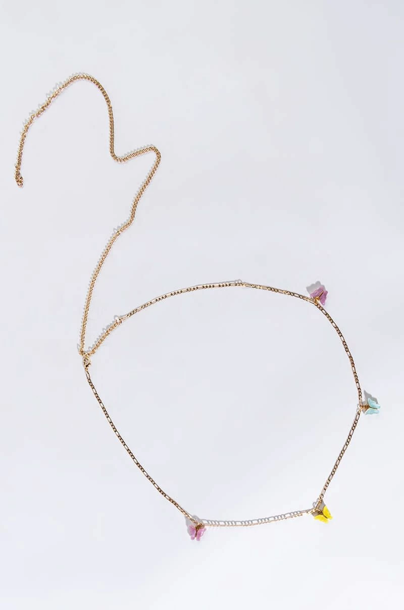 The AKIRA Label Atlanta Belly Chain features a faux gold chain base, acrylic butterfly charm accents, and an adjustable lobster claw closure. Wear these with your bikini this summer for an effortlessly chic look!