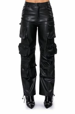 Strike a pose! The AKIRA Label Basically A Model PU Cargo Pant is made from a pebbled faux leather fabrication and features a high rise waist, belt loops, a classic five-pocket design, cargo flap and button flap pockets along the legs, a straight leg silhouette, toggle drawstring ankle hems, and a button and zipper front closure.
