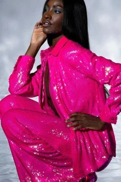 Party season just got a little chicer. The AKIRA Label Bright Bright Pink Sequin Trouser features a mesh base, an ultra-glam sequin-embellished fabrication, a high rise waistline, wide pant legs, and a front zipper closure with a hook and eye slide bar. Complete your look with the matching AKIRA Label Bright Bright Pink Sequin Shirt.