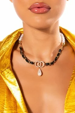 Enchanté! The AKIRA Label Call Me Coco Pearl Chain Necklace is made from a faux gold metal base and features pearl chain ends with gold balls and a ribbon chain center with a rhinestone and pearl-detailed linked circles charm. Complete with pearl dangle details and an adjustable lobster claw closure.