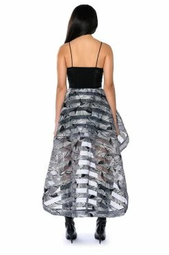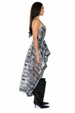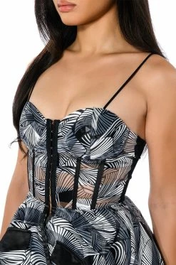The AKIRA Label Made For You High Low Corset Top is a floaty, feminine number featuring a corset bodice, padded bust cups, slim tank straps, a sweetheart neckline, contrast seam detailing, satin faux pocket accents, and boning for structure. Complete with a sheer organza base, a dramatic, cascading high low silhouette, graphic print patterning, tulle inner lining, a reinforced hemline, hook and eye front closures, and a smocked mesh back. Pairs perfectly with pointy toe pumps and trousers.