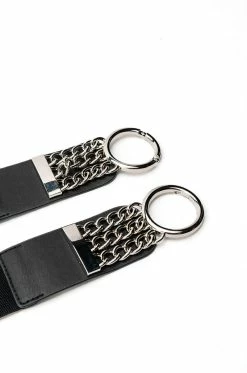 The AKIRA Label Celebration Chain Detail Stretch Belt is a wide waist belt featuring leather front plackets, silver metallic hardware, wide elastic straps, chain link detailing, and an interlocking circular front closure.