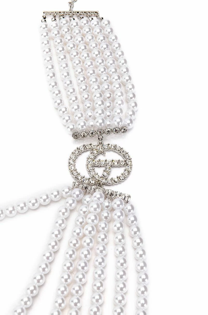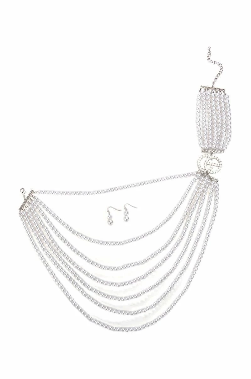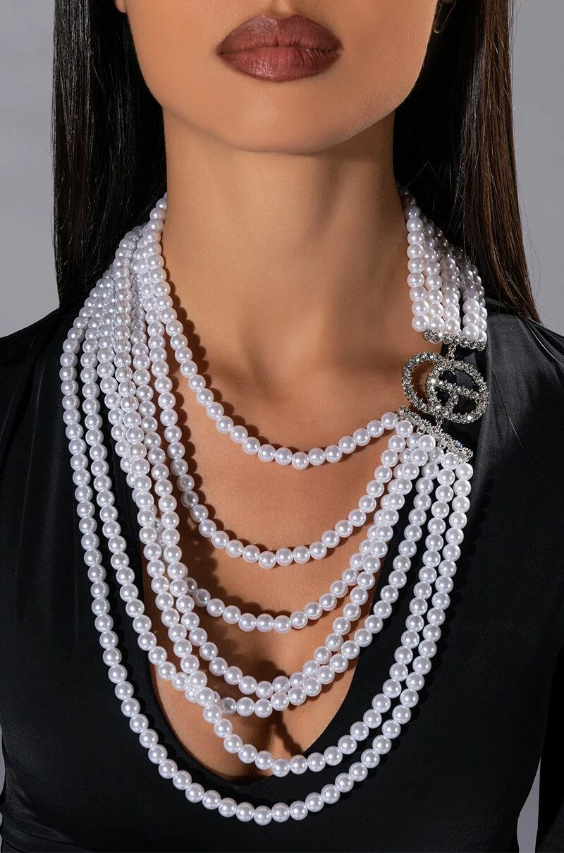 Elegance personified. The AKIRA Label Coco Layered Pearl Necklace is a single statement necklace featuring a draped beaded pearl base, a layered silhouette, an interlocking circular rhinestone accent, silver metallic hardware, and a lobster claw clasp fastening.