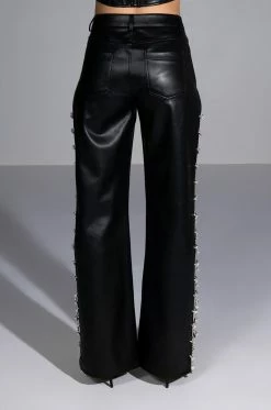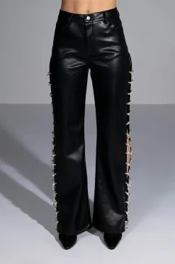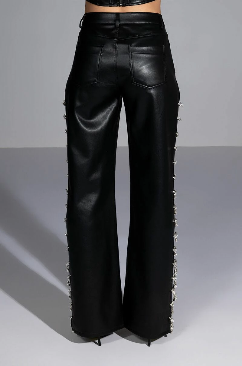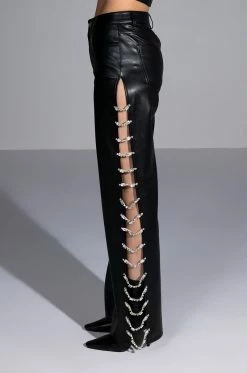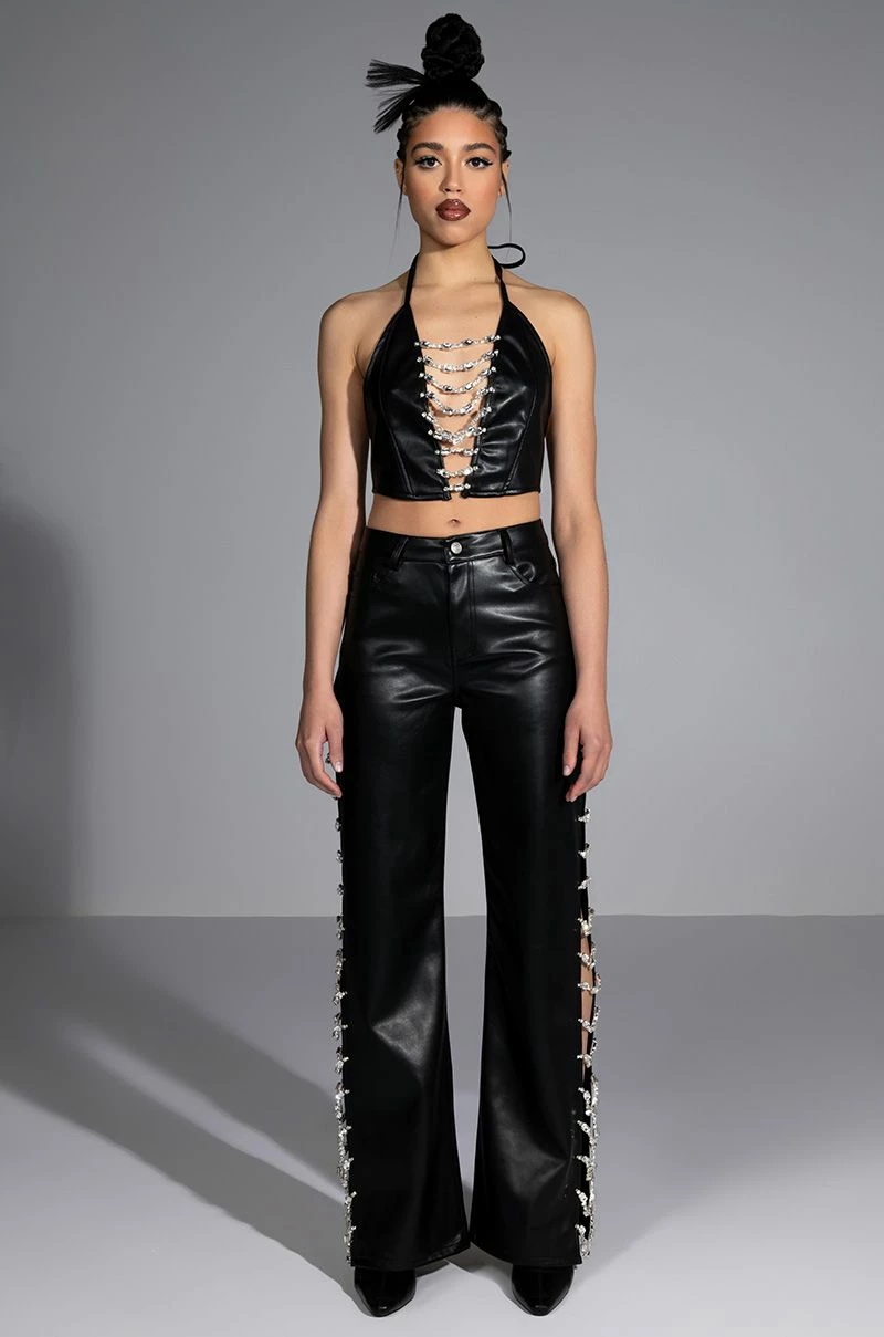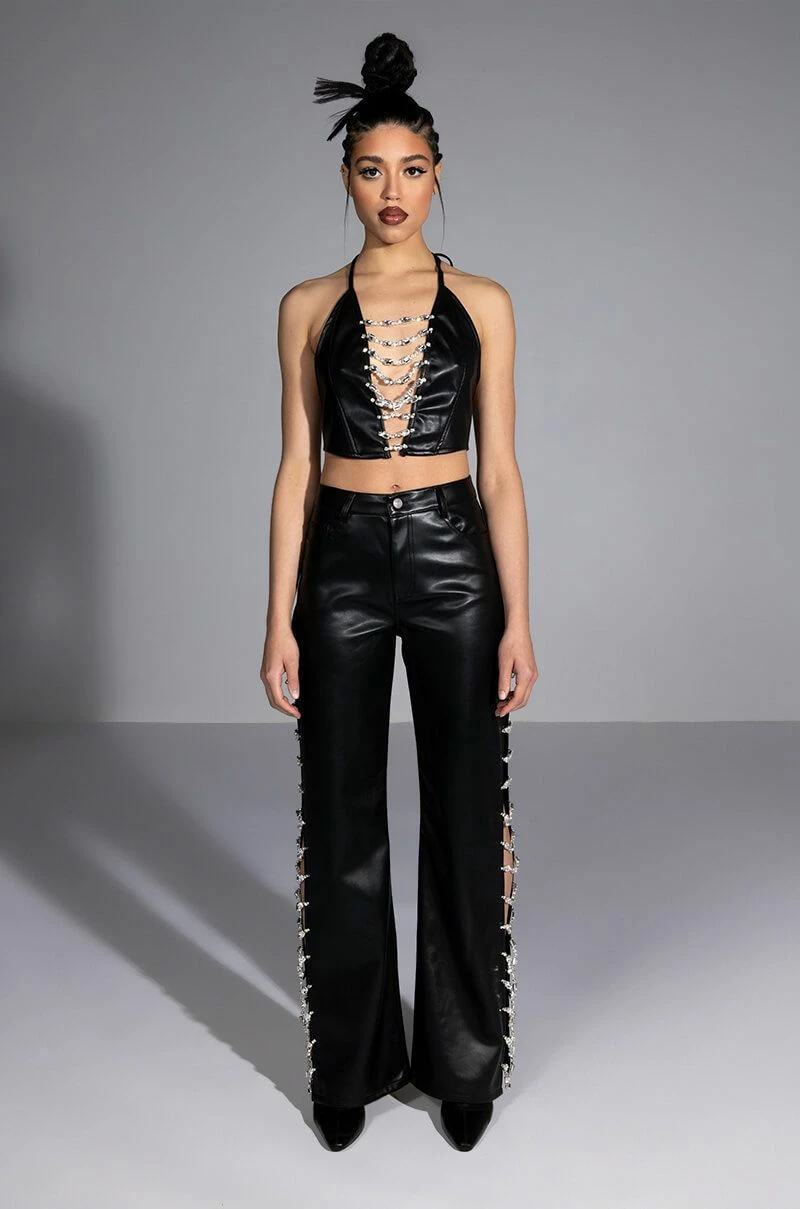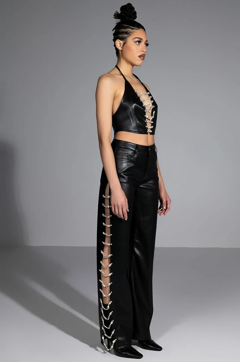 So cool and refreshing. The AKIRA Label Covered In Ice Faux Leather Rhinestone Pant features a stretchy yet supple vegan leather fabrication, a high rise waist, belt loops, a classic five-pocket design, relaxed pant legs, long, sexy side slits with rhinestone gem link detailing, and a button and zipper closure. Complete with an ultra-soft suede-inspired lining. Pair with the coordinating AKIRA Label Covered In Ice Faux Leather Tank Top for a complete look.
