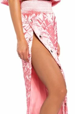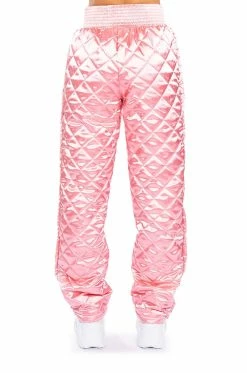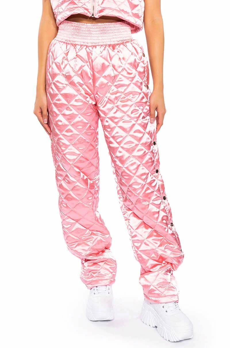 Comfort never looked so cute! The AKIRA Label Cozy Mode Quilted Satin Breakaway Jogger in Pink features a quilted satin fabrication, a high rise waist, a ruched elastic waistband, straight pant legs, silver metallic hardware, and breakaway pop button sides. Pair this piece with the coordinating AKIRA Label Cozy Mode Quilted Satin Vest for a complete look.