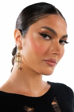 Bring the drama with The AKIRA Label Cross My Heart Embellished Drop Earrings. This sparkling accessory features a tiered, dangle style silhouette, a faux gold metallic base, and a cross with gemstone accents and pearl details. Complete with post back fastenings.