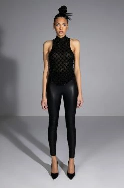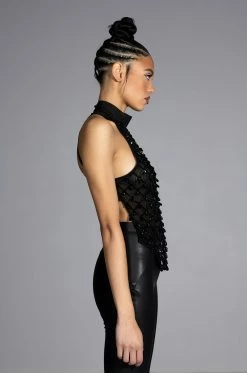The AKIRA Label Date Night Beaded Crop Top features a sheer chiffon fabrication, a sleeveless silhouette, a button-back mock neckline, and a sexy backless design. Complete with lattice-inspired beadwork, a rounded cropped hem, and a back strap with hook and eye closures for security. Style with a sensual lace bra and leather pants for a chic look.