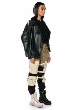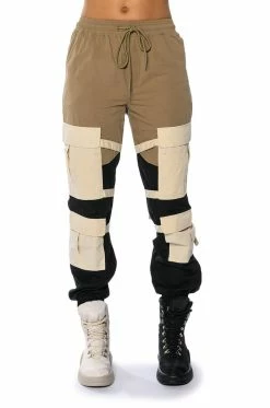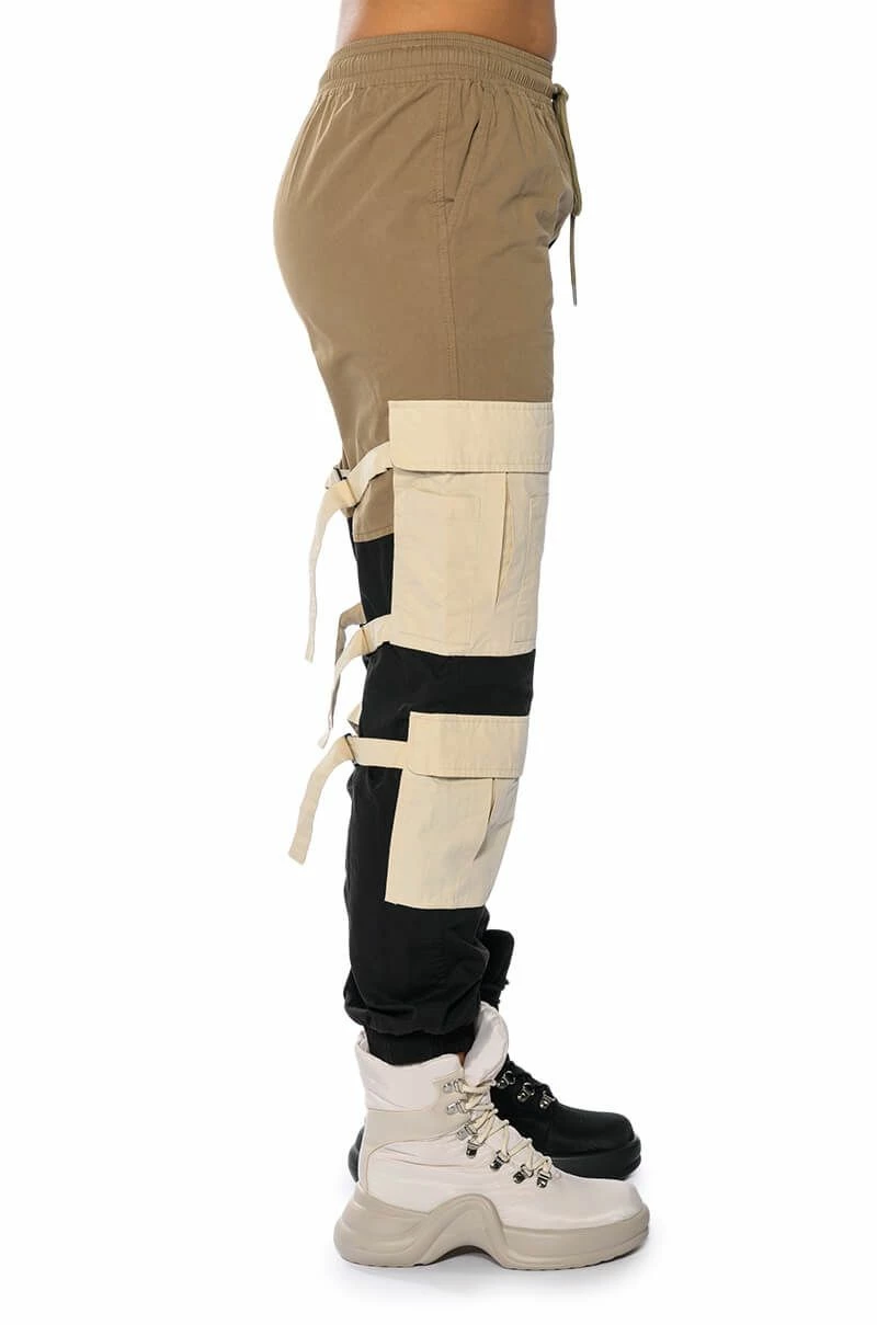 The AKIRA Label Road Trip Color Blocked Cargo Jogger features a structured cotton fabrication, a ruched elastic waistband, drawstring detailing, slant side pockets, cargo thigh and ankle pockets,and cinched ankle hems. Complete with strappy accents and a color block construction. Pair these unique bottoms with a crop top and chunky sneakers.