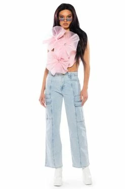 The AKIRA Label Eliza Denim Cargo Pant is made from a washed denim fabrication and features a high rise waist, working belt loops, front pockets, cargo flap back and side pockets, a wide leg silhouette, and a doubled button and zipper front closure. Pair this piece with the matching AKIRA Label Eliza Denim Corset Top and chunky sneakers to complete your look.