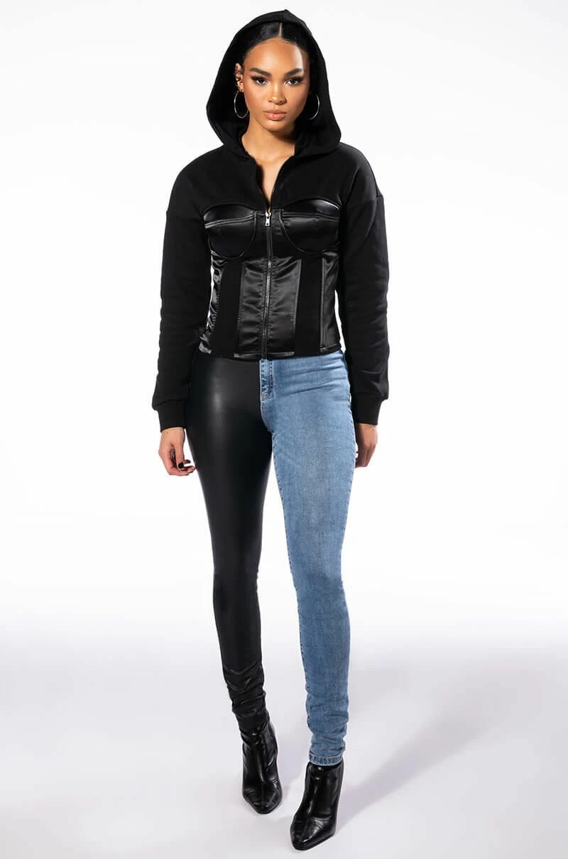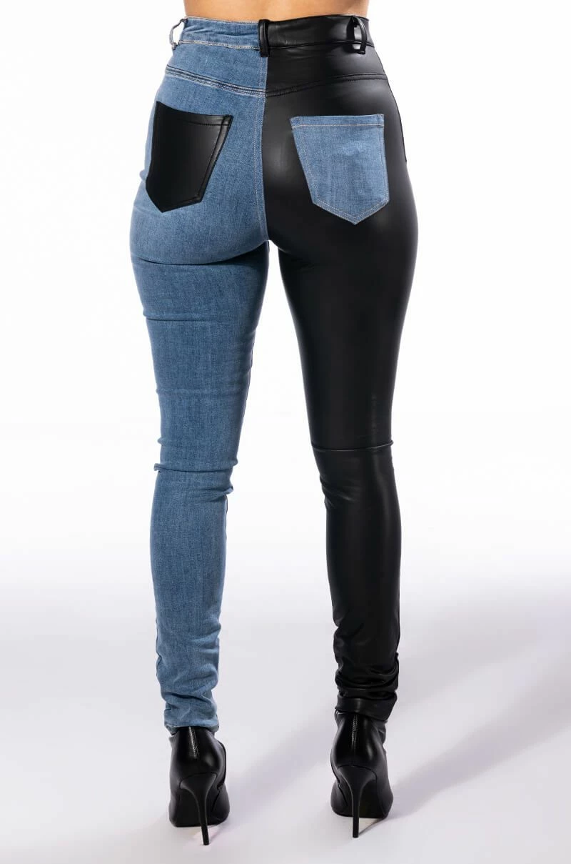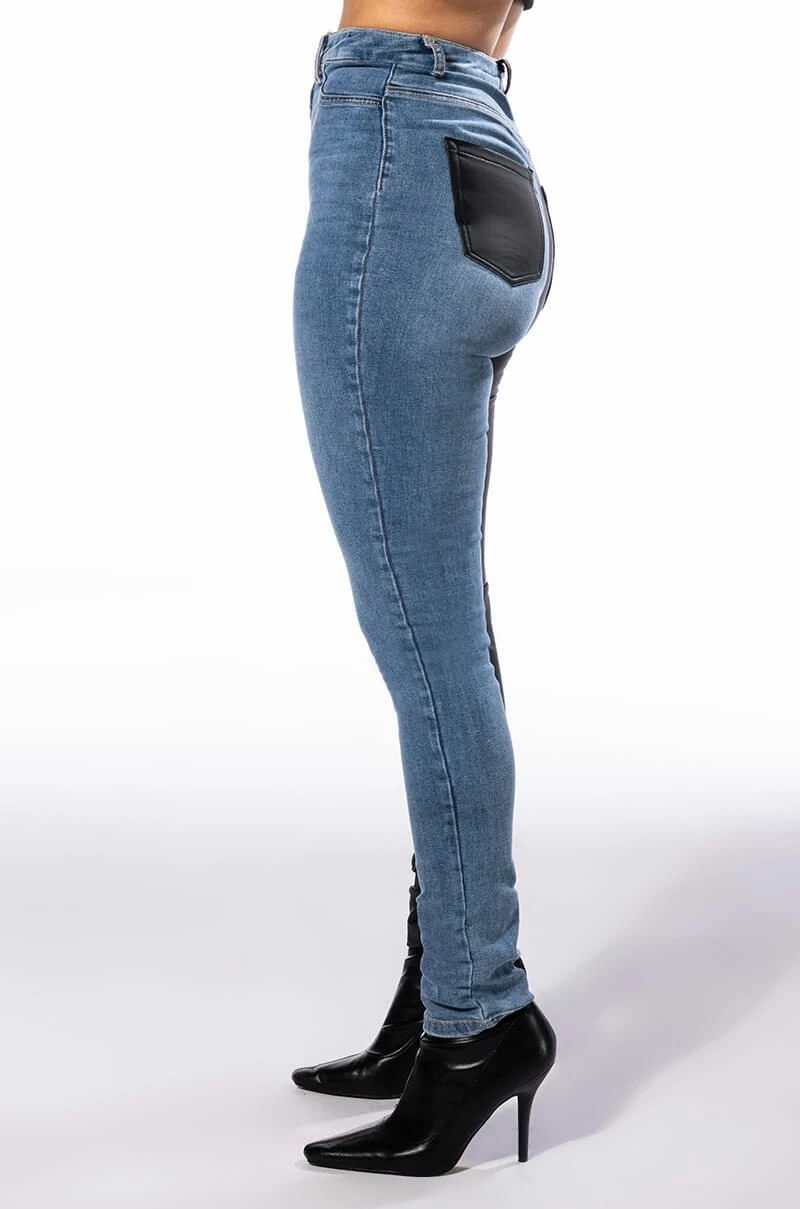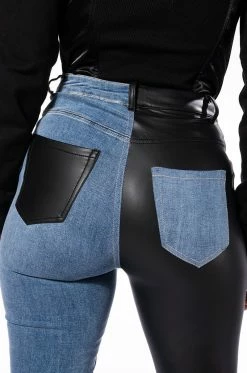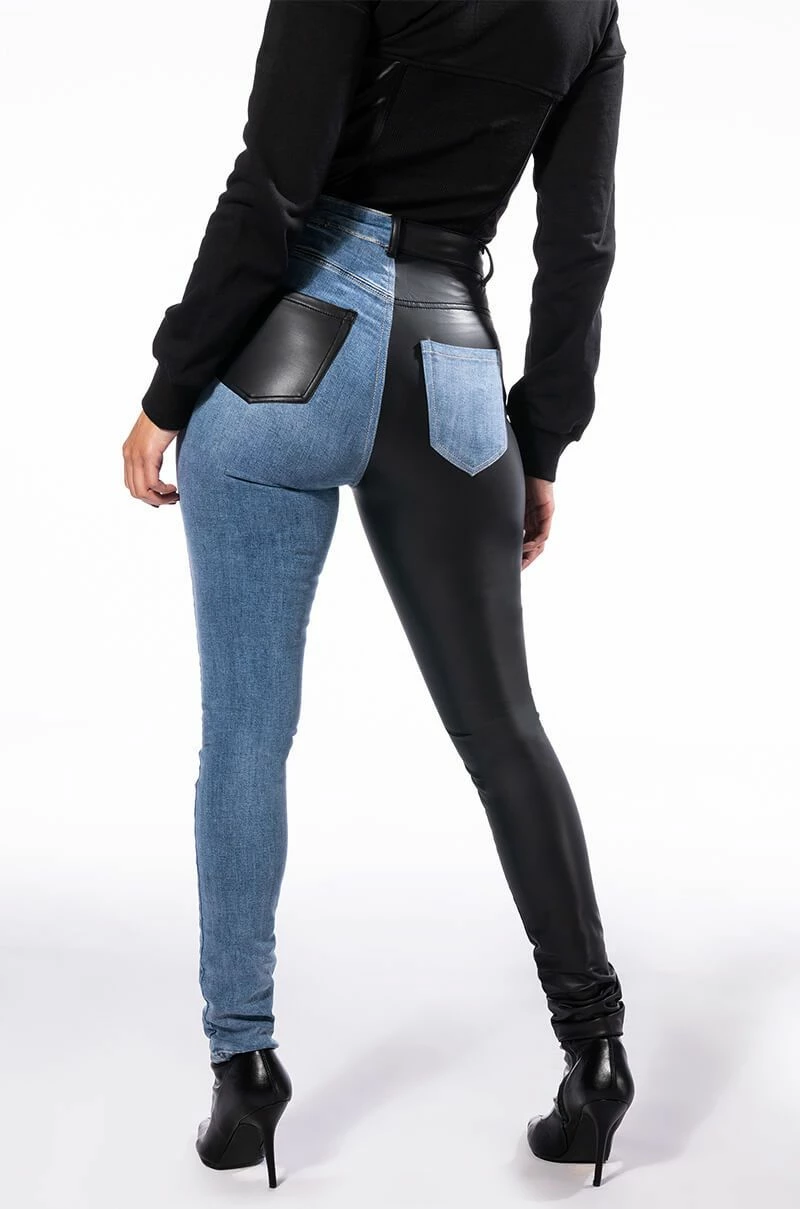 You get the best of both worlds with The AKIRA Label Flex Fit Extreme Stretch Half And Half PU High Waist Skinny Jean! These ultra-stretchy denim bottoms feature a super stretchy curve-hugging stretch denim knit construction, a high rise waist, a faux leather leg and back pocket, a classic zip button closure, and a skinny leg fit complete with functioning belt loops. Style with your fave graphic crop tops and sleek ankle booties for a casual moment that puts your sexy self front and center.