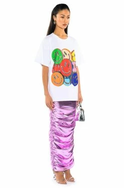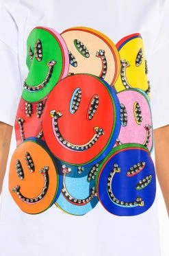 The Fun For You Tshirt is an oversized stretch cotton graphic t-shirt featuring a crew neckline, boxy short sleeves, and smiley face graphic print patterning. Complete with rhinestone stud detailing and silver metallic accents.