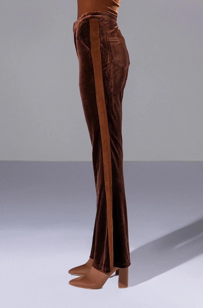 Weβre giving 70βs chic with The AKIRA Label Gabrielle Velvet Flare Trouser! These high-waisted bottoms are made from a velvet fabrication and feature slant side pockets, working back pockets, and a flared leg silhouette. Complete with a tonal corduroy stripe along the sides and a zipper to hook-and-eye front closure. Pair these pants with a cropped tee, moto jacket, and heeled boots for the full fantasy!