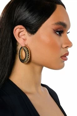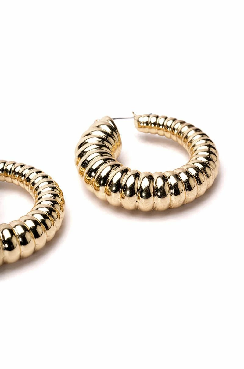 The AKIRA Label Go Time Textured Hoops are a set of door knocker hoops made from a faux gold metal base featuring a textured design, a medium hoop silhouette, and lever back fastenings.