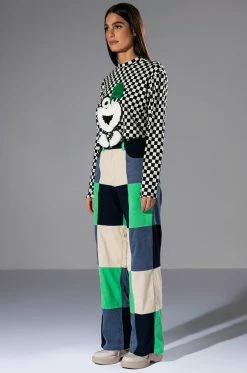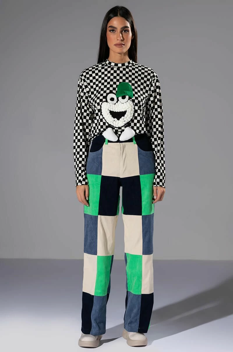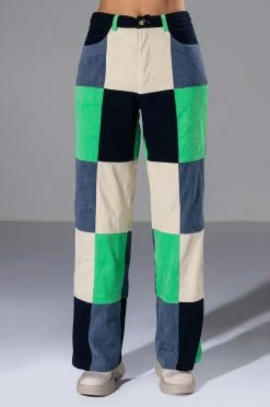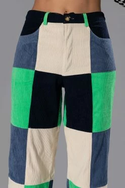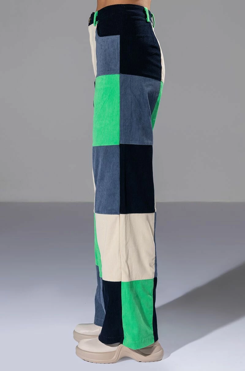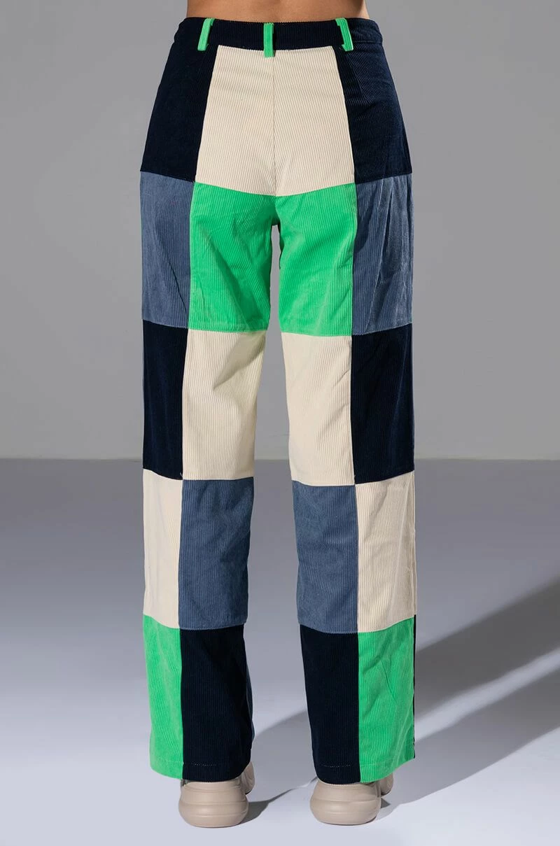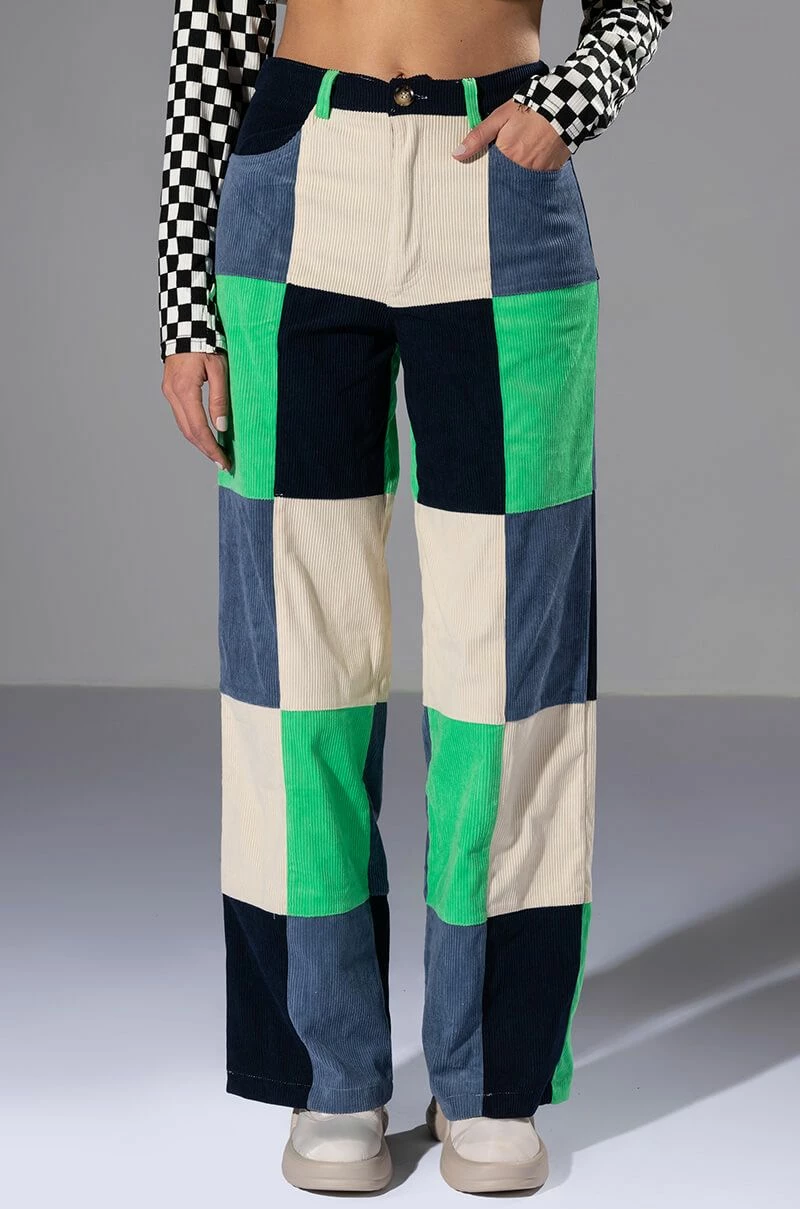 Make a statement in The AKIRA Label Hallie Color Blocked Wide Leg Pants! These bottoms feature a soft, corduroy fabrication, a high rise waistline with classic zip-up button closure, bold colorblock detailing, a wide leg silhouette, and working belt loops. Style these colorful and fun pants with platform pumps and a cropped tee to complete your look.