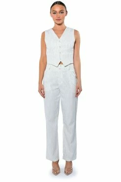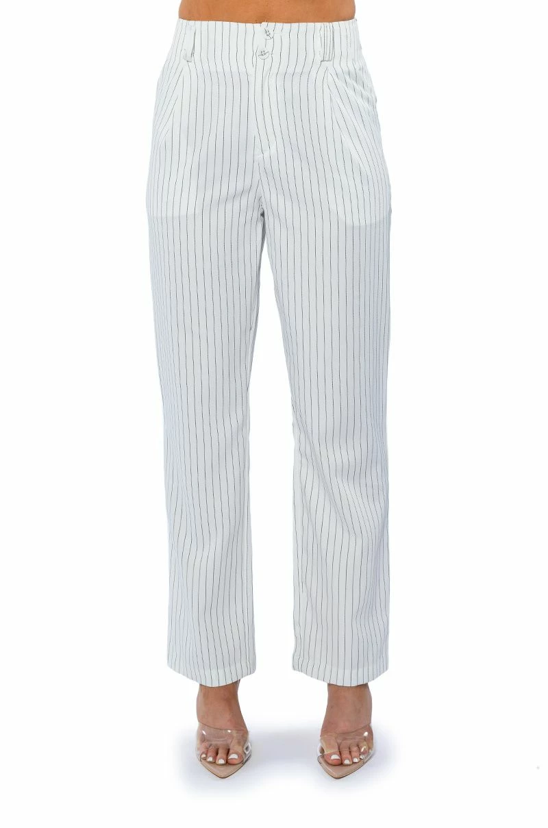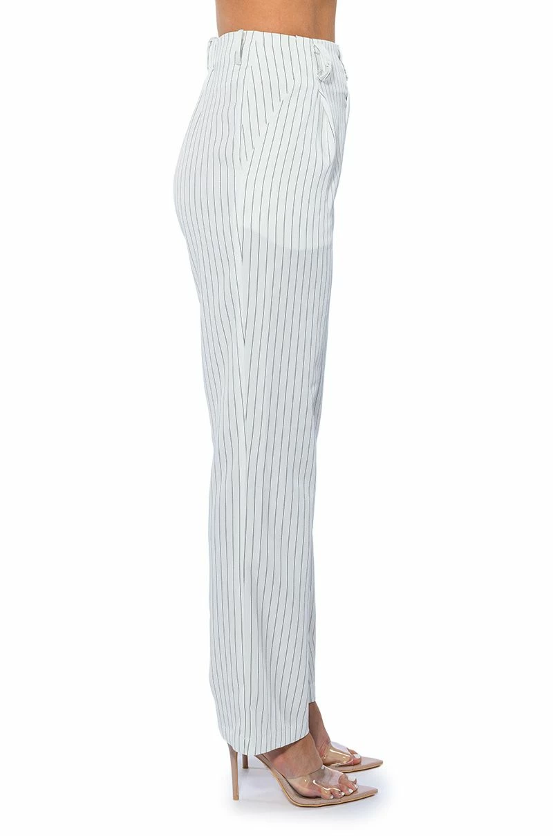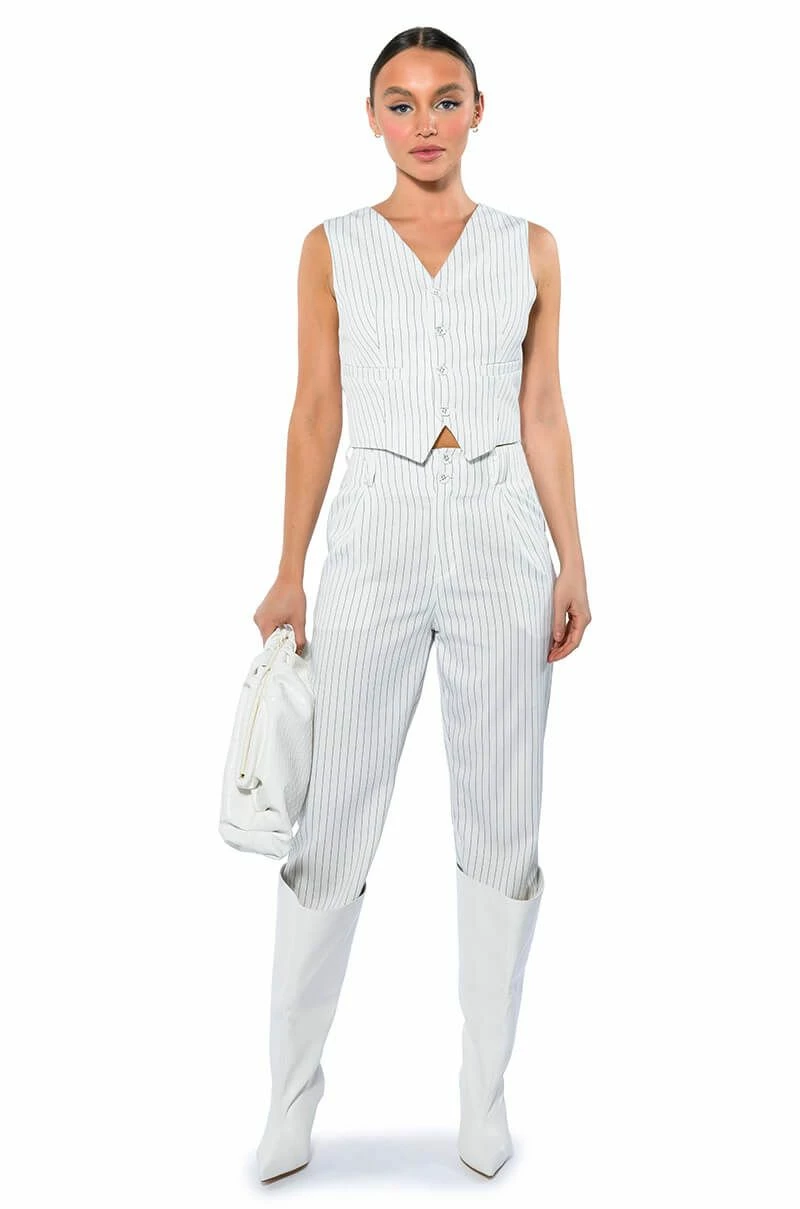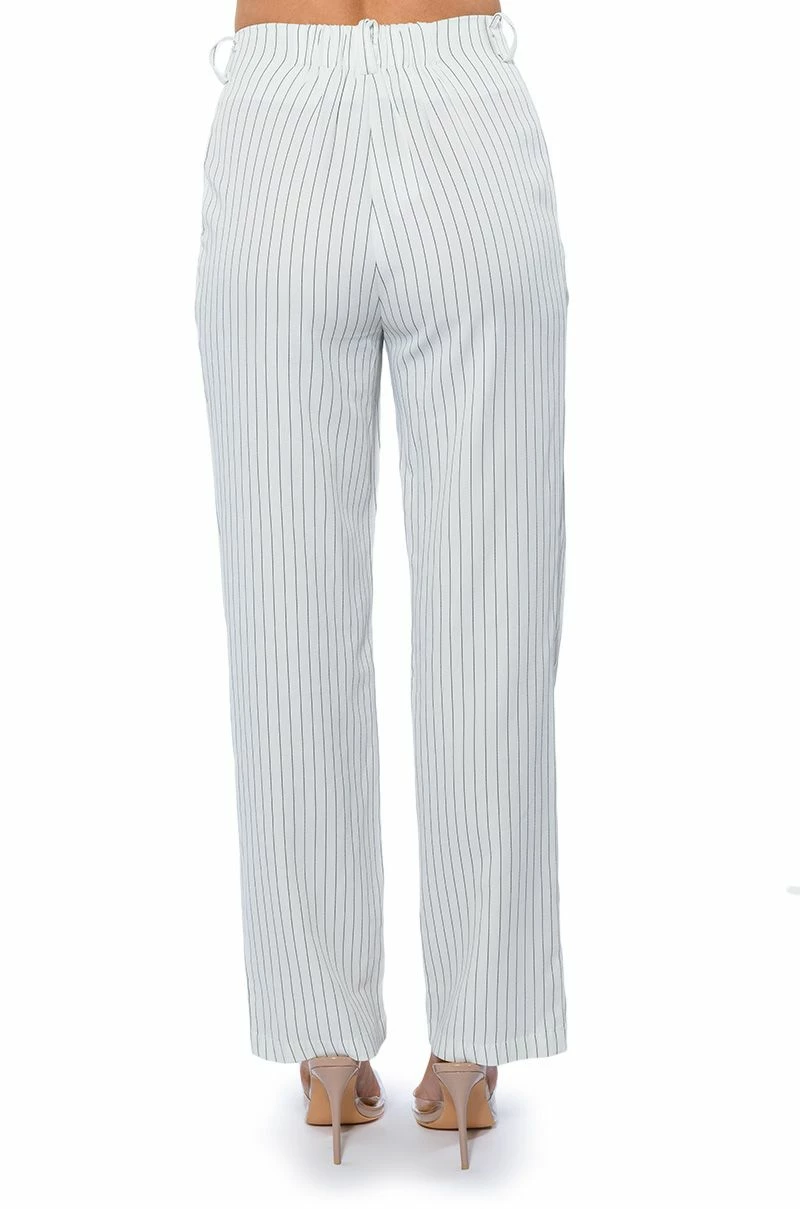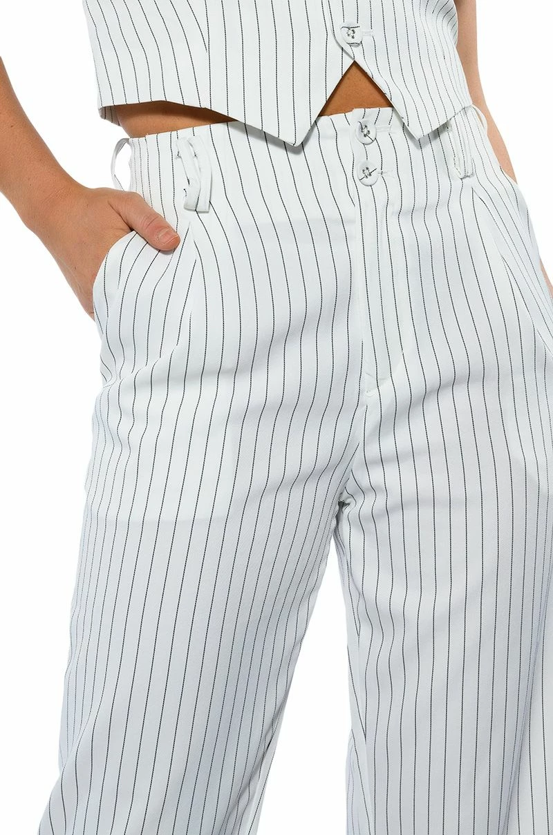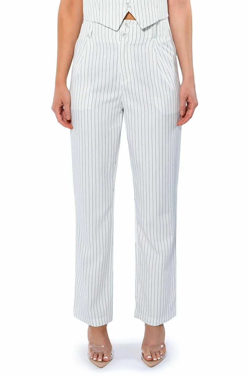 The AKIRA Label Hamburg Street Style Trouser is made from a soft woven fabrication and features pinstripe patterning, a high rise waist, a wide ruched elastic back waistband, doubled belt loops, slant side pockets, pleated detailing, a straight leg silhouette, and a doubled button and zipper front closure. Pair this piece with the matching AKIRA Label Hamburg Street Style Vest to complete your look.