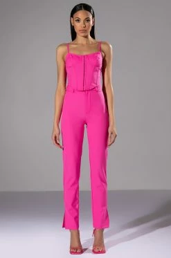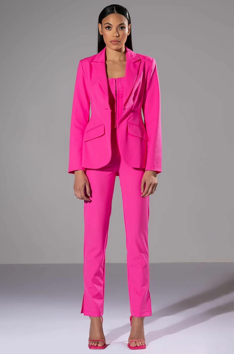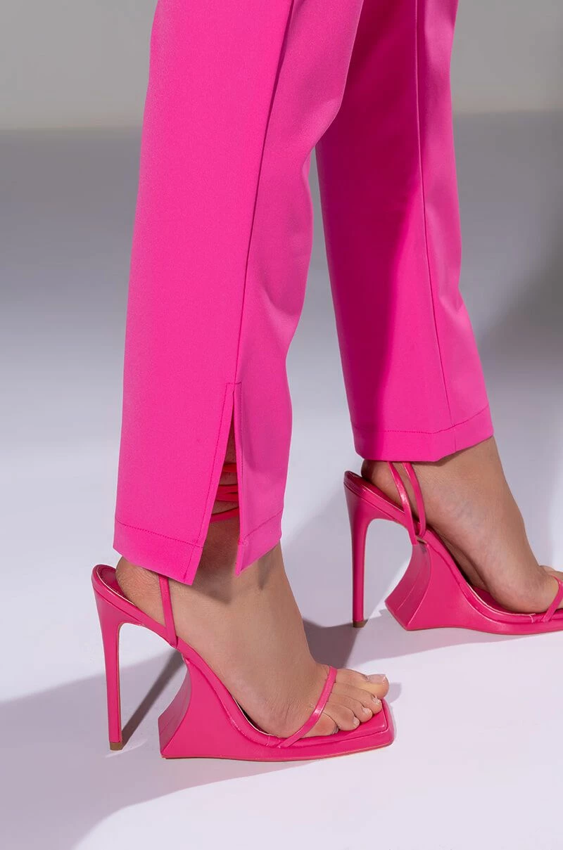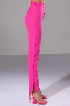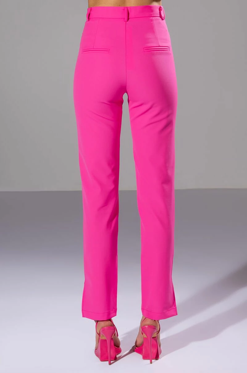 The AKIRA Label Hansel High Rise Pants With Slits is a slick, lightweight trouser featuring a high rise waistline, working belt loops, flattering seam detailing, and a straight leg silhouette. Complete with outer ankle slit accents, faux back pockets, and a front clasp zipper closure. Pair this classic trouser with the matching The AKIRA Label Hansel Front Hook And Eye Corset and Hansel Fitted Blazer for a fashionable tailored look!