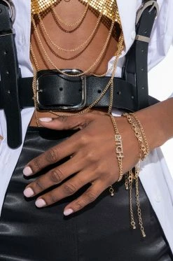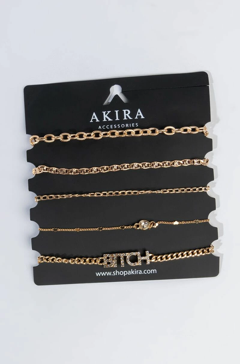 The AKIRA Label Here For It Bracelet Set features five separate gold chain link pieces. Each bracelet features a unique chain link silhouette, the final includes โBitch,โ letterset pave pendant. All are complete with adjustable lobster claw fastenings.