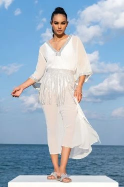 ensemble. This silver metallic piece features a rhinestone-link base, coordinating embellished fringe detailing, and a square belt buckle. Style with a shirt dress for added sex appeal.