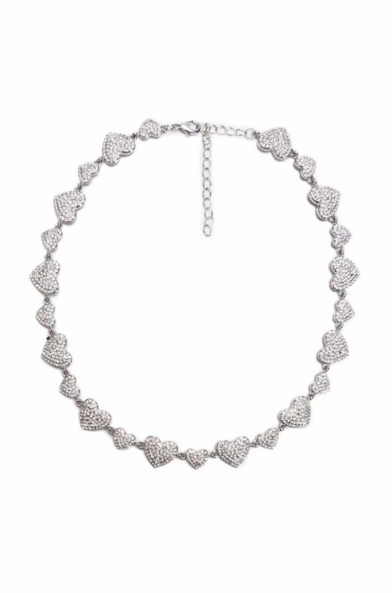 The AKIRA Label Icy Heart Necklace is made from a faux silver base and features linked pave rhinestone heart charms in a pattern of varying sizes with an adjustable lobster claw closure.