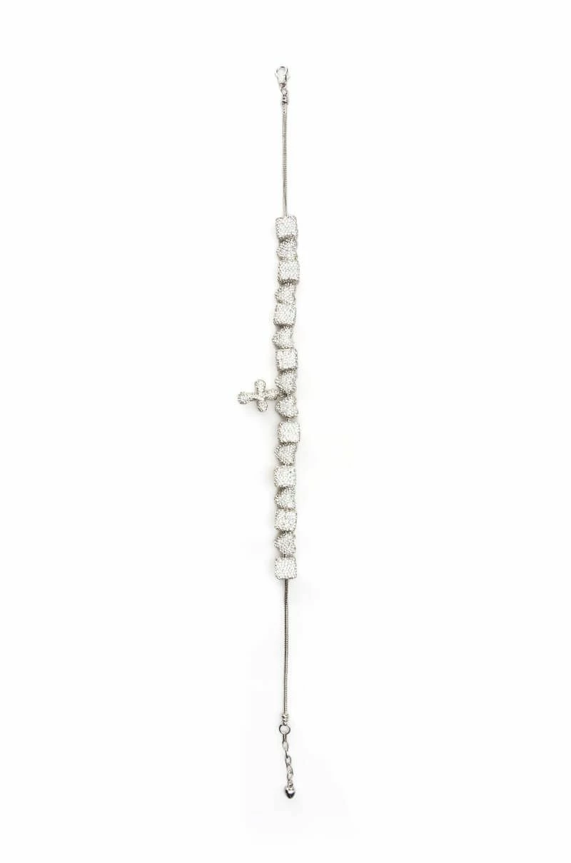 The AKIRA Label In Drop I Trust Necklace is made with a silver snake chain link base and features rhinestone cube and heart charms with a rhinestone cross pendant. Complete with an adjustable lobster claw closure.