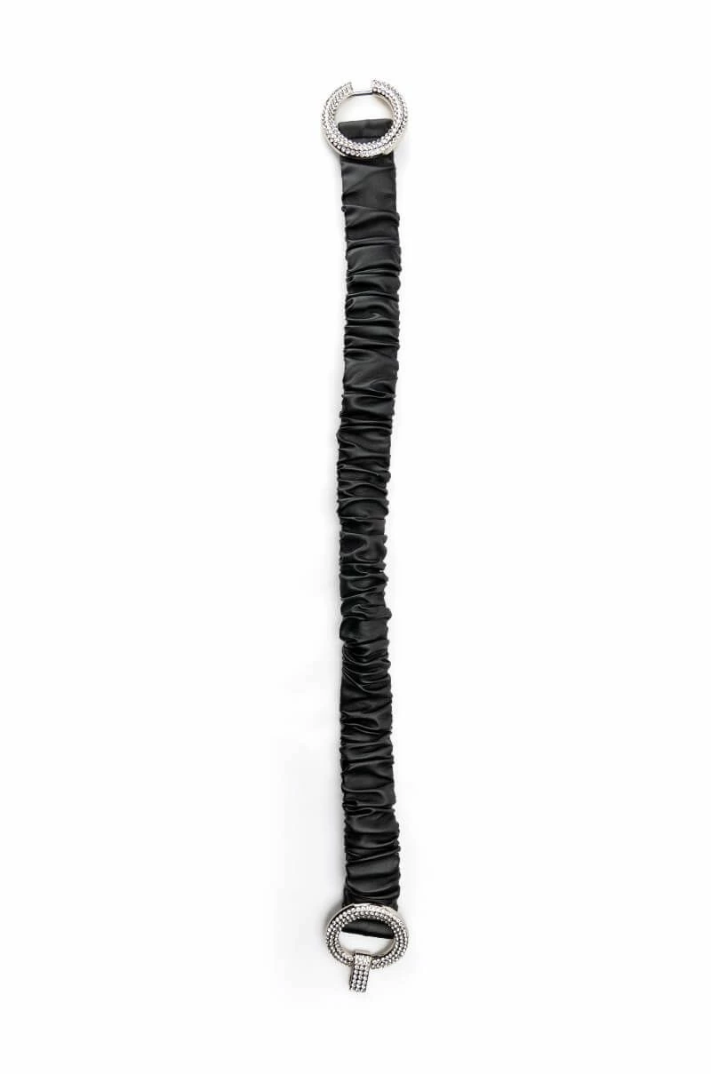 You’ll be transported to infinity and beyond with the AKIRA Label Infinity Rings Scrunchie Belt! This blinged-out belt is made from an elastic base and features a scrunched vegan leather outer layer with an interlocking silver metal rhinestone ring closure.