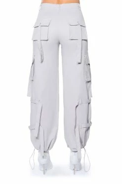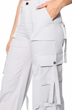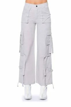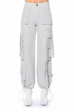 The AKIRA Label It Is Back Cargo Pants are made from a structured cotton fabrication and feature a high rise waist, working belt loops, front patch pockets, tasseled snap button cargo pockets, tie belt detailing, a wide leg silhouette, and toggle drawstring hems. Complete with a button and zipper front closure.