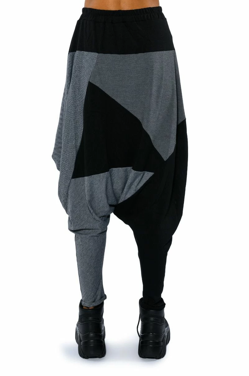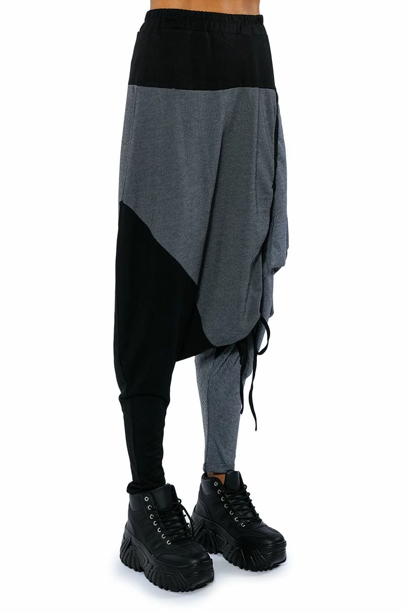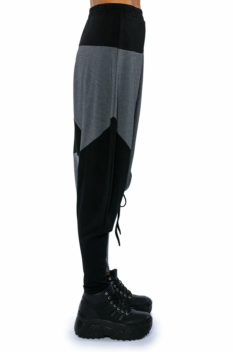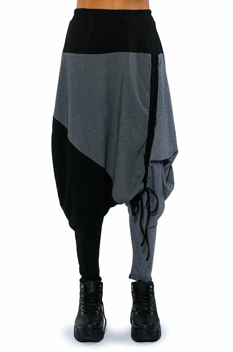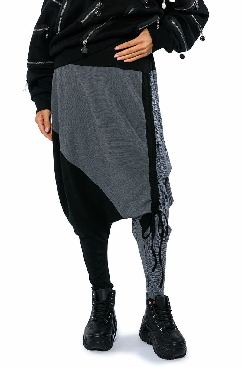 The AKIRA Label Next Lifetime Cinched Asymmetrical Drop Waist Joggers are a cozy cotton blend pant featuring a drop crotch design, a ruched elastic waistband, voluminous hip detailing, a tapered leg silhouette, and colorblock stripe print patterning. Complete with an adjustable, asymmetrical ruched side accent with drawstring closure. Pair with a cozy hoodie and flatform sneakers..