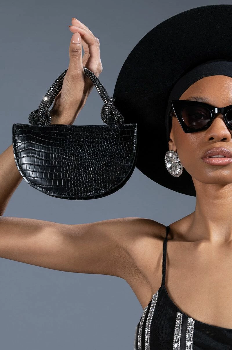 What’ve you got to lose? The AKIRA Label Kiss Me More Semi Circle Purse is made from a faux leather croc base and features knotted rhinestone rope top handles, a semi circle-shaped body, a magnetic snap button closure, and a detachable croc and chain strap.