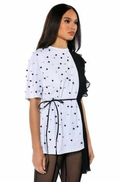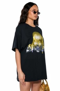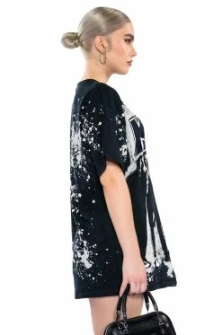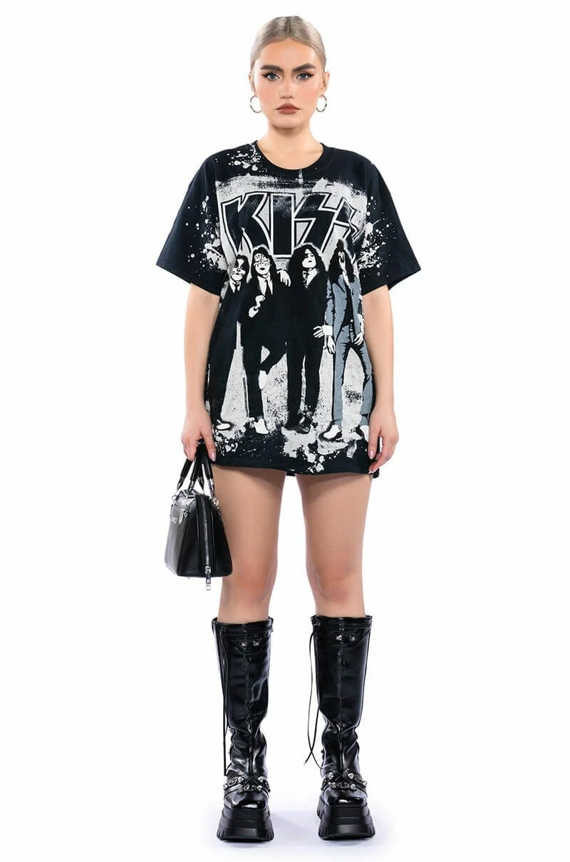 The Kiss Short Sleeve Graphic Band Tee features a crew neckline, short sleeves, and an oversized silhouette. Complete with an allover splatter spray paint print, the band’s name, and an illustration of the band. Pair with distressed relaxed denim jeans and loafers.
