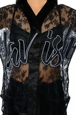 The AKIRA Label Lavish Floral Lace Jersey is made from a sheer floral lace fabrication and features a boxy silhouette, short sleeves, satin trim detailing, a rounded hem, and button down front closures. Compete with large front “Lavish” suede patch text detailing.