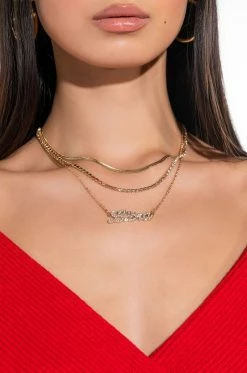 Dainty jewelry with a personal touch, what’s not to love? The AKIRA Label Libra Layer Necklace is a faux gold layered necklace featuring a triple chain link design, rhinestone-embellished “Libra” script charm, and lobster claw clasp.