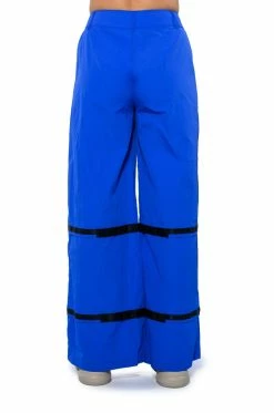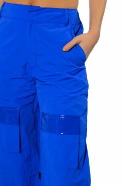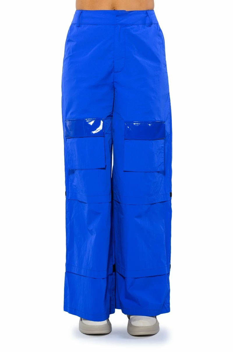 The AKIRA Label Life’s A Breeze Lightweight Cargo Pant features a lightweight windbreaker-inspired fabrication, a high rise waist, slant side pockets, flap front cargo pockets with patent accents, and a wide leg silhouette. Complete with a zip front hook and eye front closure and sporty banded detailing across the back.