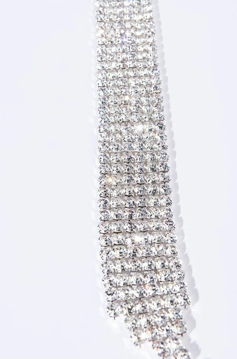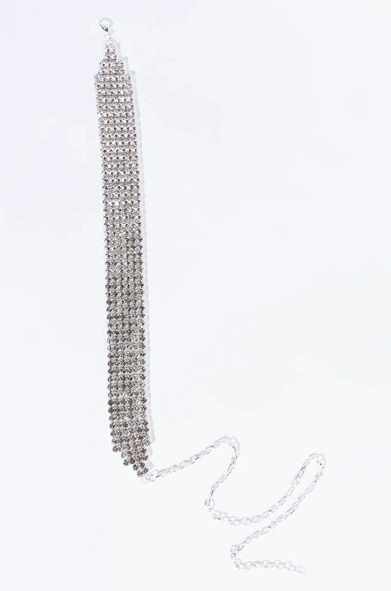 YOLO! The AKIRA Label Live It Up Silly Rhinestone Belt is a thick rhinestone link accessory complete with a silver base and adjustable lobster claw fastening.
