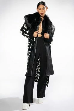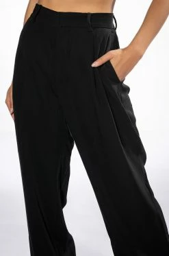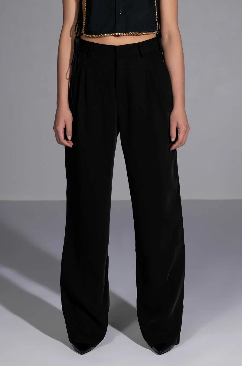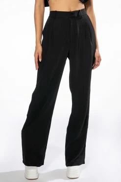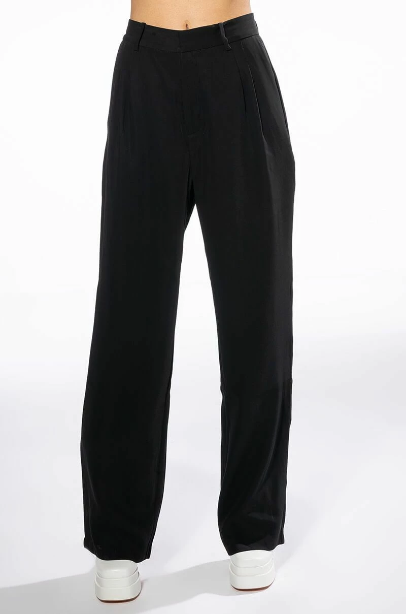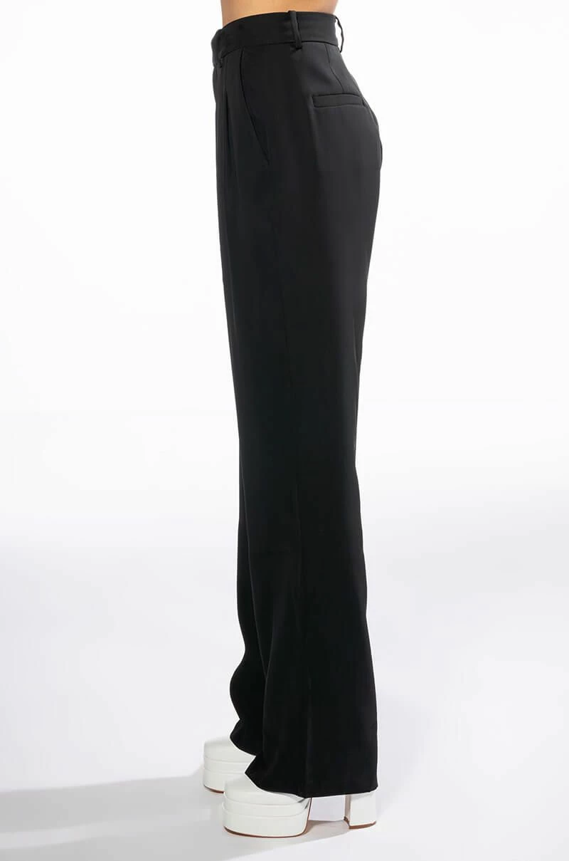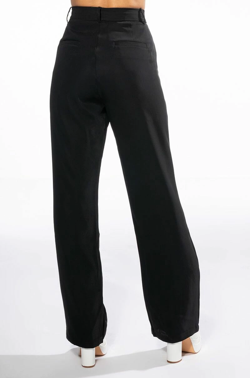The AKIRA Label Logan Wide Leg Trouser In Black is made from a slick, lightweight fabrication and features a high rise waist, a wide waistband, working belt loops, slant side pockets, pleated stitching, jetted back pockets, and a wide leg silhouette. Complete with a double clasp and zipper front closure. Pair this suited-up piece with a mock neck top and pumps to complete your tailored look.