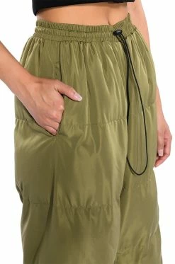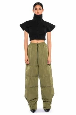 The AKIRA Label Lorena Wide Leg Puffer Pant is made from a slick fabrication and features a high rise waist, a ruched elastic waistband with toggle drawstring detail, slant side pockets, wide puffer pant legs, and velcro ankle hems. Pair this piece with a mock neck sweater and furry booties or slides to complete your effortless and cozy look.
