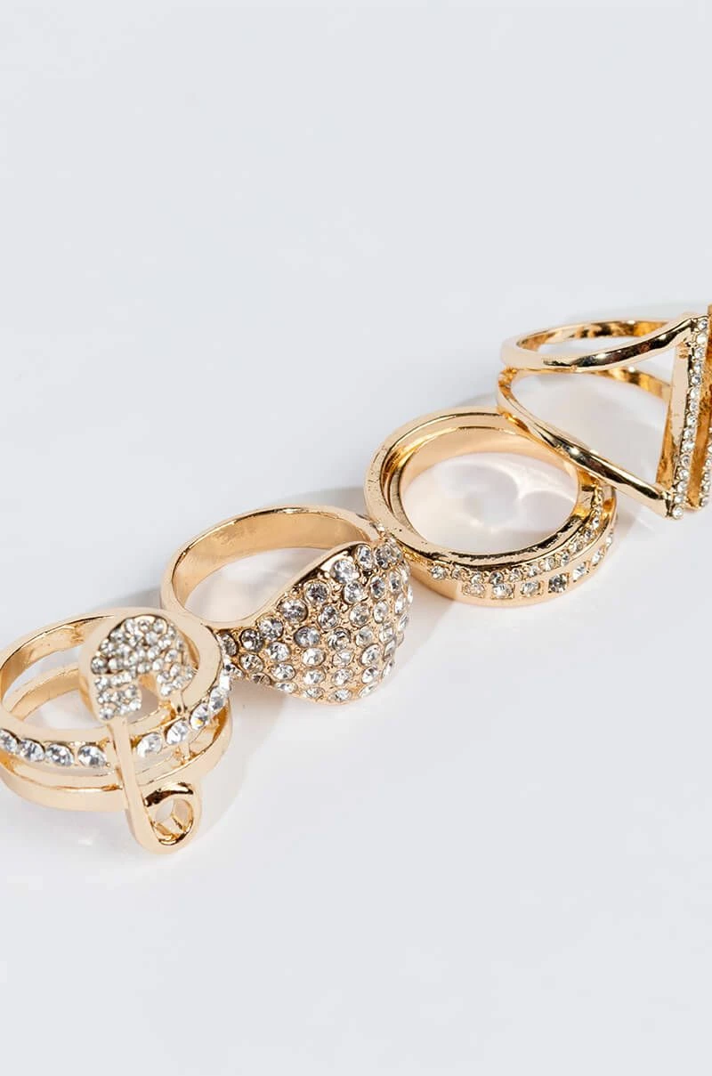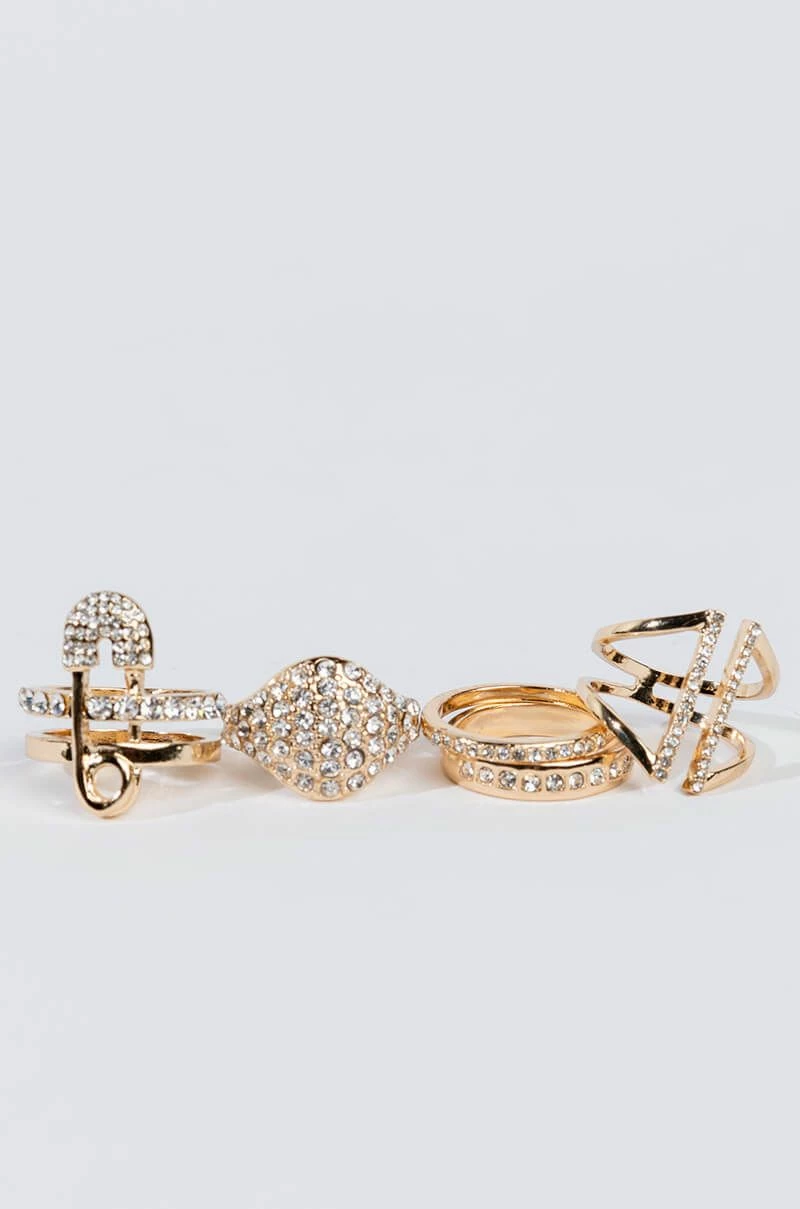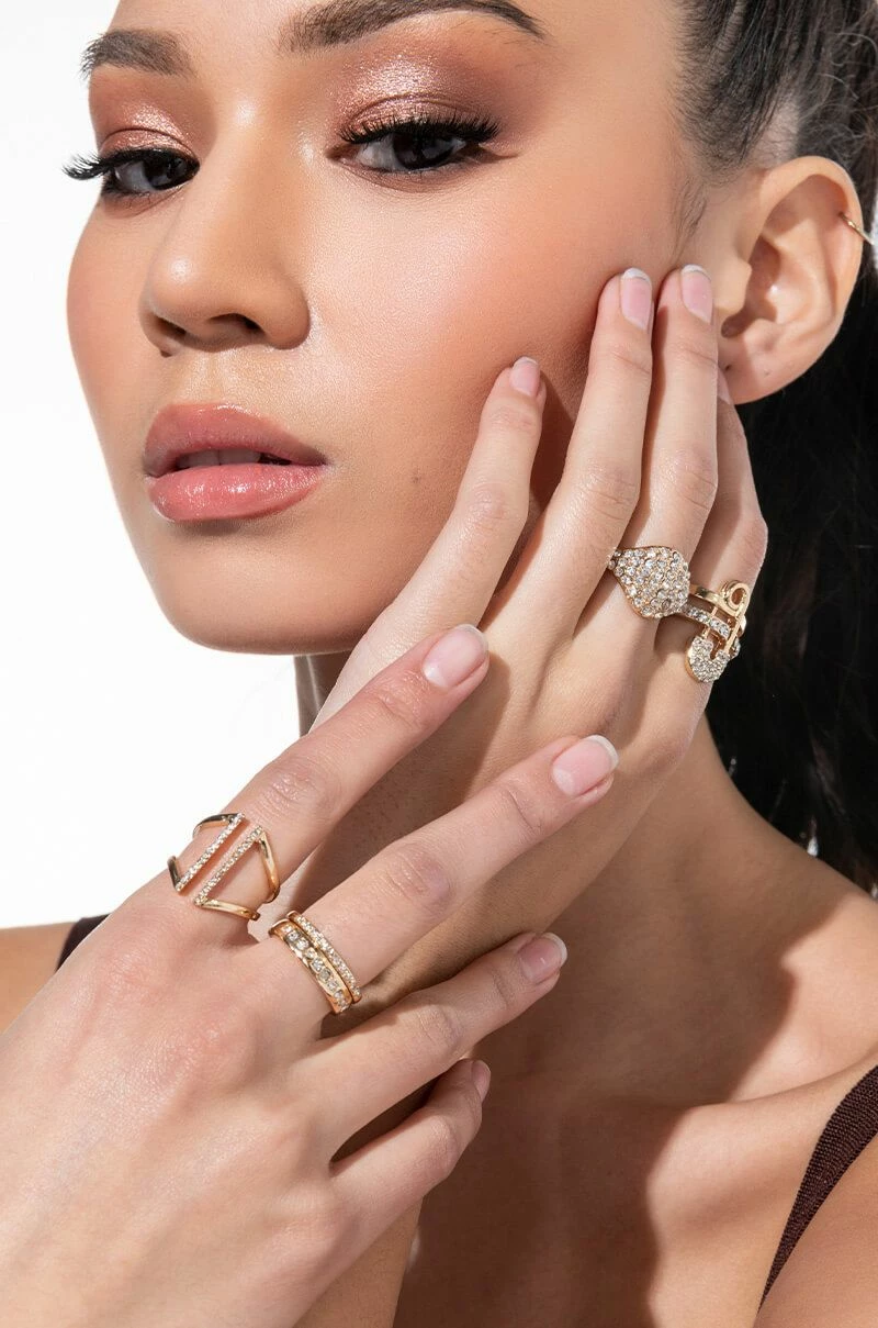 Ba da ba ba ba, we’re loving The AKIRA Label Lovinnnn’ It Rhinestone Ring Set. This collection features five unique single band rings, each with a pave faux gold base. One includes a safety pin motif, one features a pave signet silhouette, one includes an open front design, and two are simple rhinestone-inset bands.