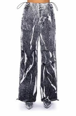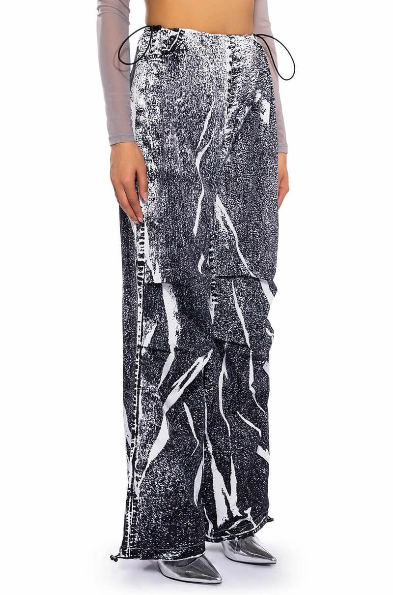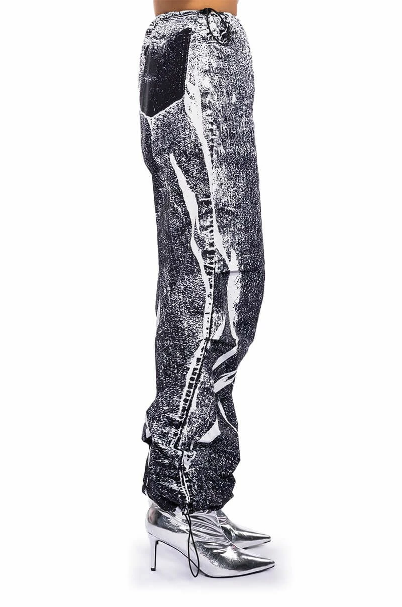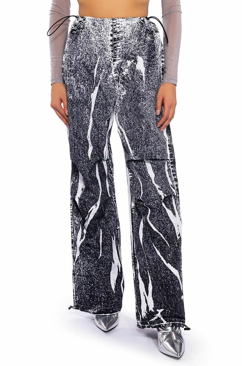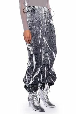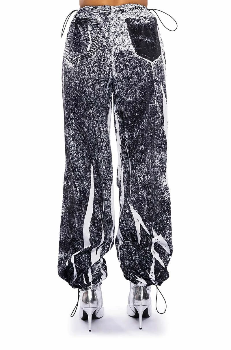 The AKIRA Label Macy Faux Denim Look Parachute Pant is made from a lightweight, sleek base fabrication and features a dark wash denim graphic print design. Complete with a dual toggle drawstring waist, a wide leg, parachute pant silhouette, and drawstring toggles at the bottom hems. Style with baby tees or bodysuits, chunky boots, and a statement piece hat, for an effortlessly iconic look.