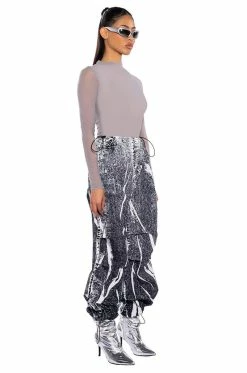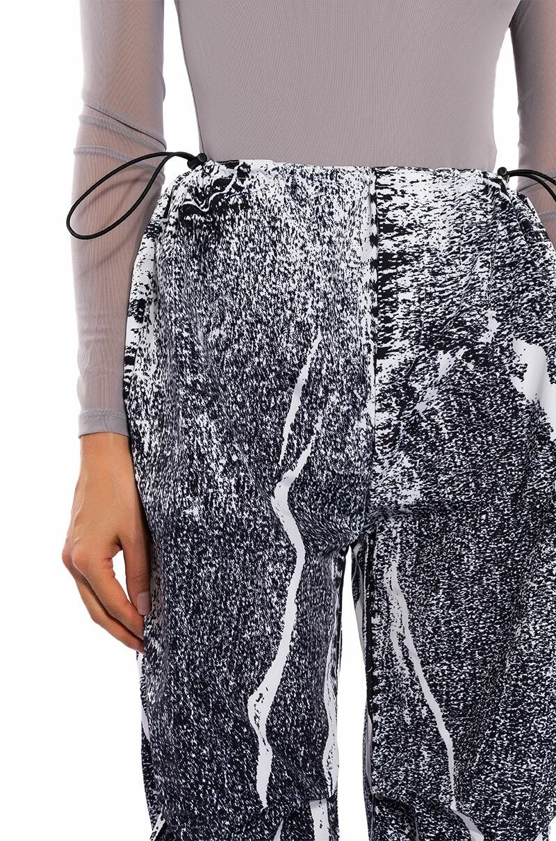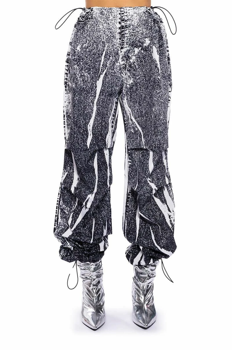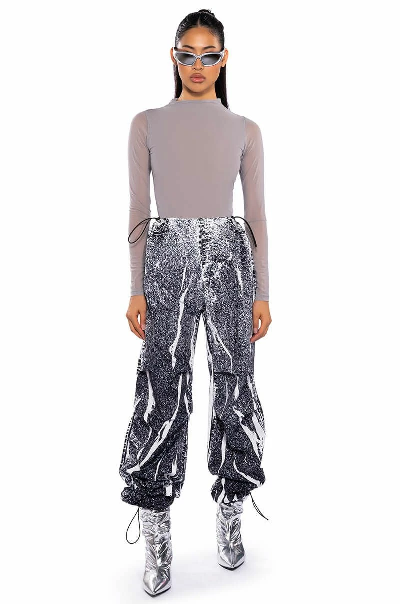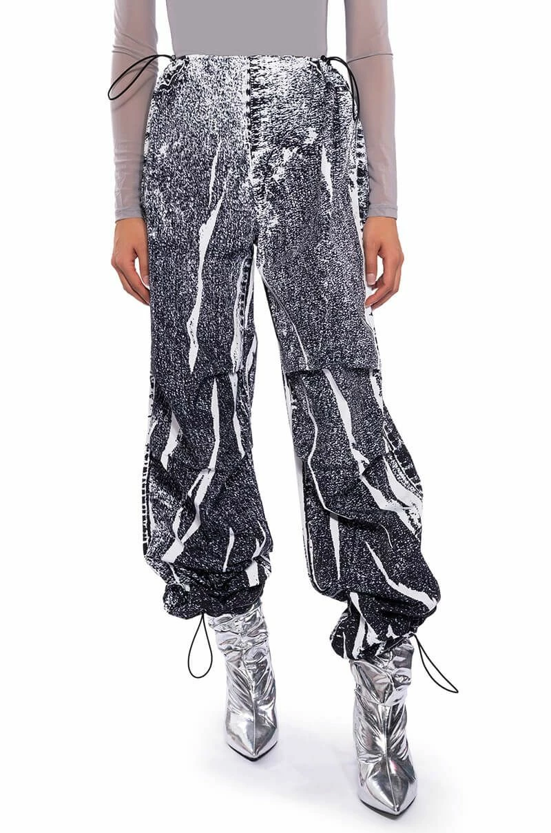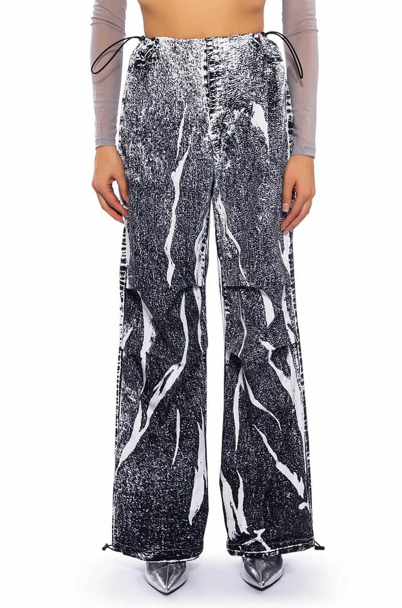 The AKIRA Label Macy Faux Denim Look Parachute Pant is made from a lightweight, sleek base fabrication and features a dark wash denim graphic print design. Complete with a dual toggle drawstring waist, a wide leg, parachute pant silhouette, and drawstring toggles at the bottom hems. Style with baby tees or bodysuits, chunky boots, and a statement piece hat, for an effortlessly iconic look.