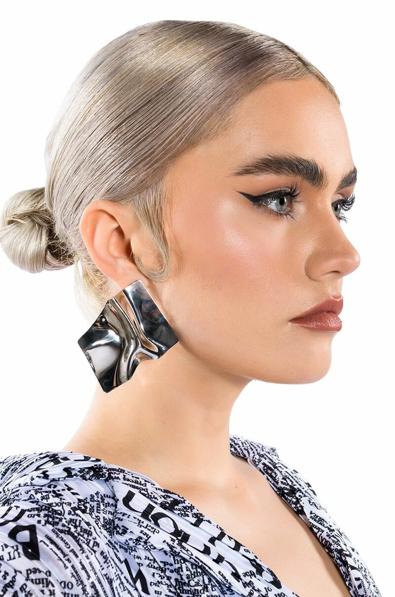 The AKIRA Label Mirror Mirror Oversized Studs are made from a textured faux silver metal base and feature an asymmetrical silhouette. Complete with post back-style fastenings and a reflective design.