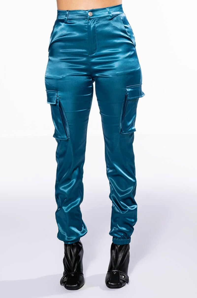 The AKIRA Label Mission Impossible Satin Cargo Jogger is a sleek and chic pant complete with a mid waist rise, zipper fly button fasten, cargo inspired side pockets, a subtle metallic sheen and cinched ankle hems.