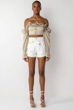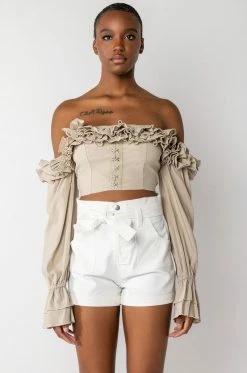 Live out your rom-com fantasy to the fullest in The AKIRA Label Modern Romance Ruffle Off The Shoulder Cropped Blouse! This romantic top is made from a lightweight fabrication and features a square neckline, long off the shoulder sleeves with layered ruffle wrists, a cropped silhouette, front hook and eye detailing, a shirred elastic back, and an exposed back zipper closure.