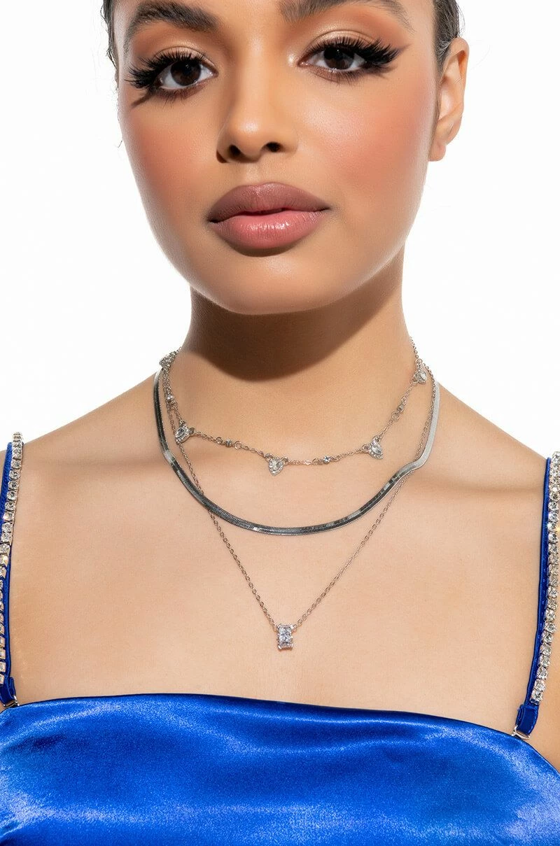 The AKIRA Label My All Silver Necklace Set is a set of two faux silver necklaces and is complete with a rhinestone embellished choker, a silver band with an attached chain link necklace with rhinestone pendant. Each necklace is complete with a lobster claw closure.