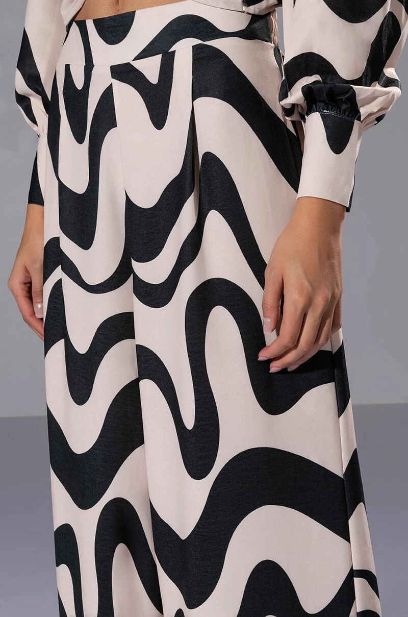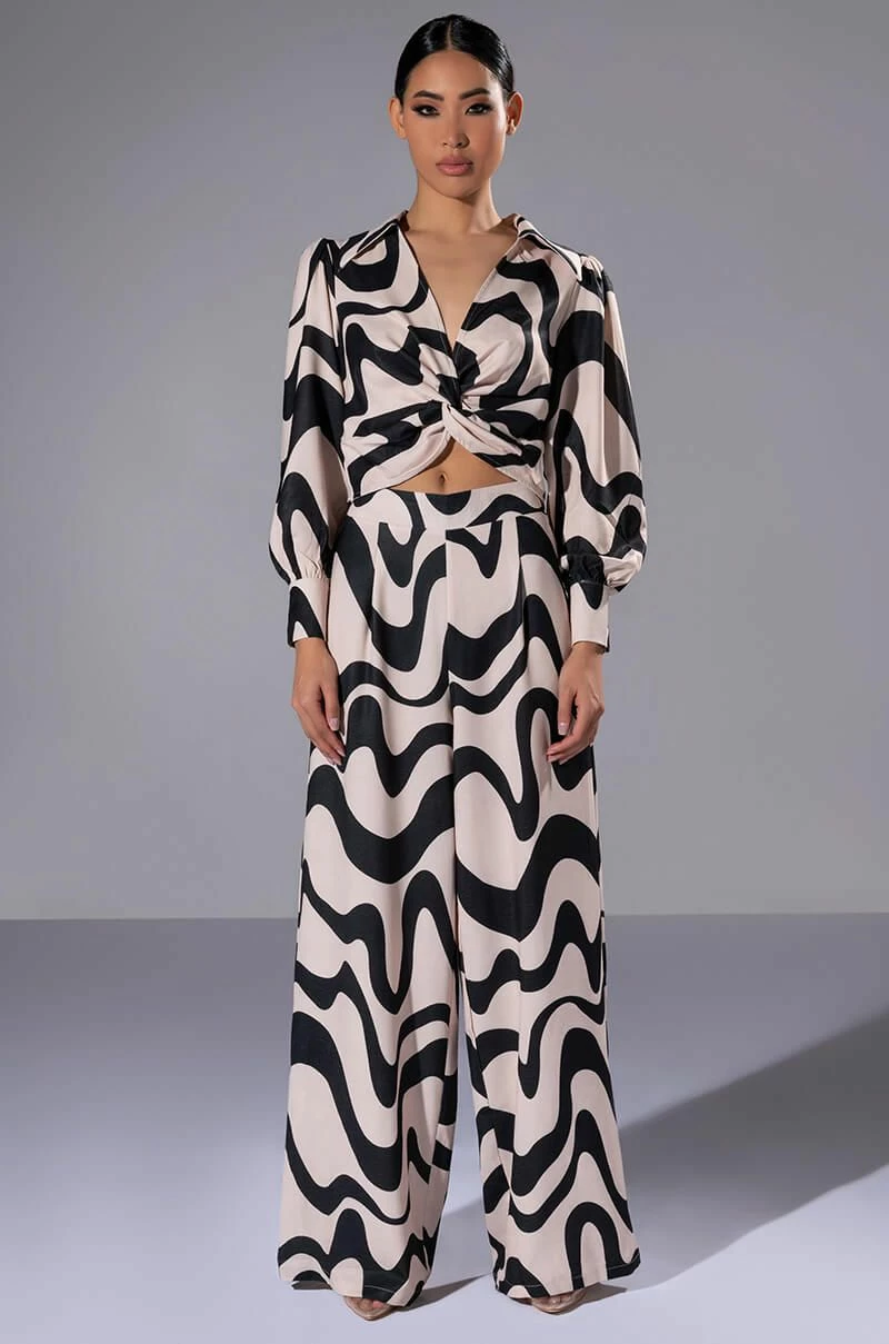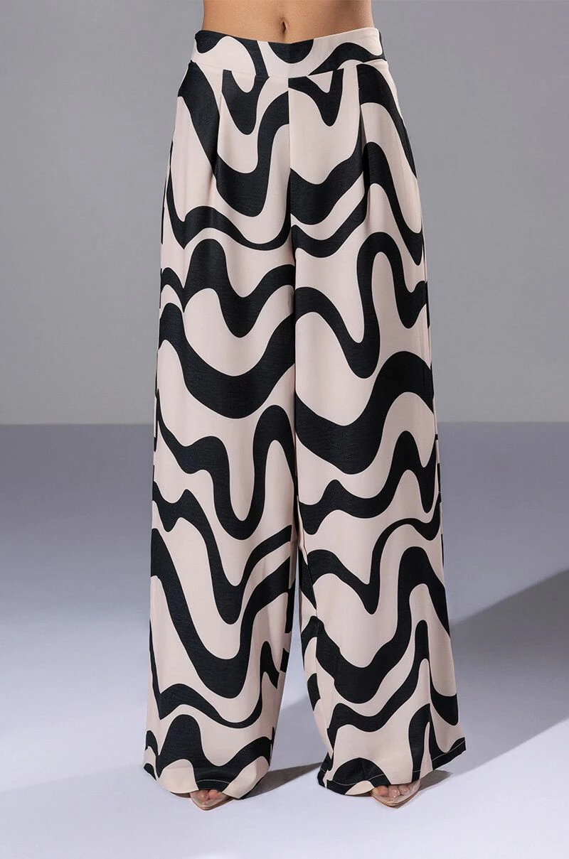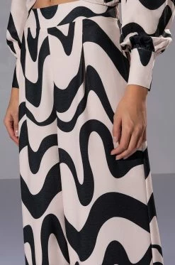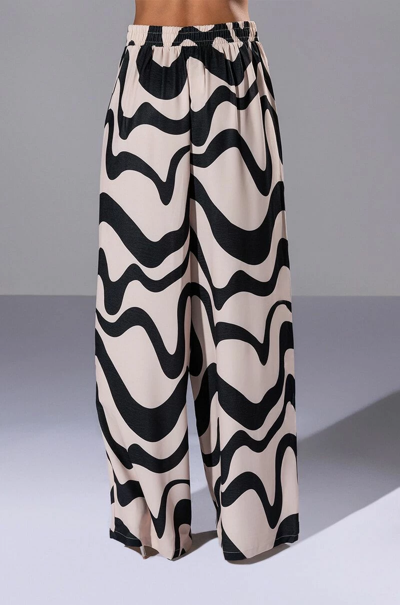 The AKIRA Label Mystical Ways Wavy Palazzo Pant is made from a soft, lightweight fabrication and features a wave colorblock print, a high rise waist, a wide waistband with a shirred elastic back band, pleated detailing, and a wide leg silhouette. Pair this piece with the matching AKIRA Label Mystical Ways Twist Front Long Sleeve Top to complete your look.