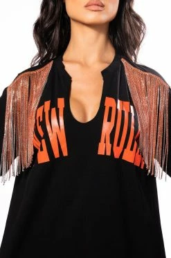 You’re in control with The AKIRA Label New Rules Rhinestone Detail Oversized TShirt. This oversized cotton tee features a plunging neckline, short sleeves, and a graphic “New Rules,” text print chest detailing. Complete with rhinestone fringe shoulders accents and a subtly notched hemline. Pair with joggers and combat boots for a complete look.